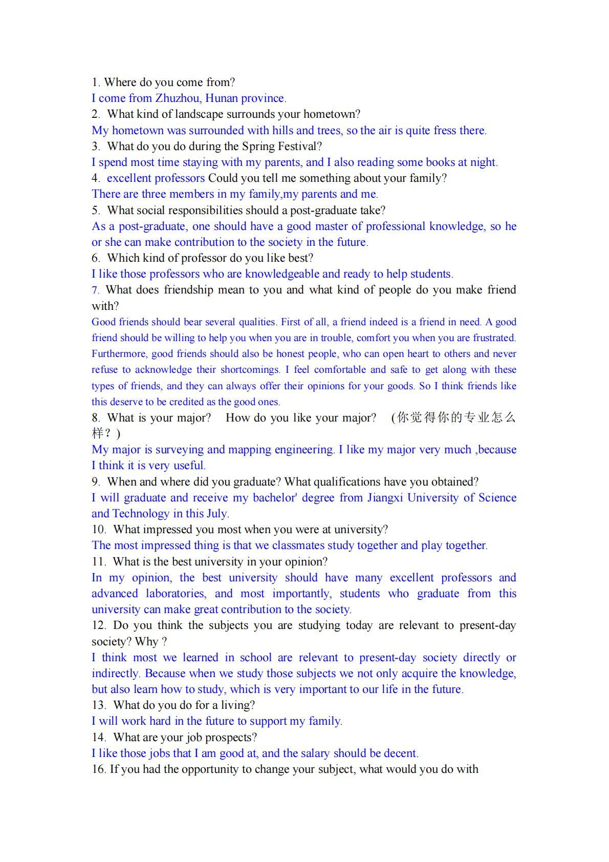 1.Wheredoyoucomefrom?IcomefromZhuzhou,Hunanprovince.2.Whatkindoflandscapesurroundsyourhometown?Myhometownwassurroundedwithhillsandtrees,sotheairisquitefressthere.3.WhatdoyoudoduringtheSpringFestival?Ispendmosttimestayingwithmyparents,andIalsoreadingsomebooksatnight.4.excellentprofessorsCouldyoutellm...