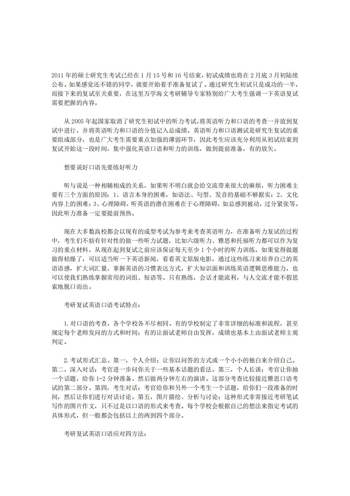 2011年的硕士研究生考试已经在1月15号和16号结束,初试成绩也将在2月底3月初陆续公布。如果感觉还不错的同学,就要开始着手准备复试了。通过研究生初试只是成功的一半,而接下来的复试至关重要,在这里万学海文考研辅导专家特别给广大考生强调一下英语复试需要把握的内容。从2005年起国家取消了研究生初试中的听力考试,将英语听力和口语的考查一并放到复试中进行,并将英语听力和口语的分值记入总成绩。英语听力和口语测试是研究生复试的重要组成部分,也是广大考生需要重点加强的薄弱环节,因此考生应该充分利用从初试结束到复试开始这一段时间,集中强化英语口语和听力的训练,做到提前准备,有的放矢。想要说好口语先要练好听...