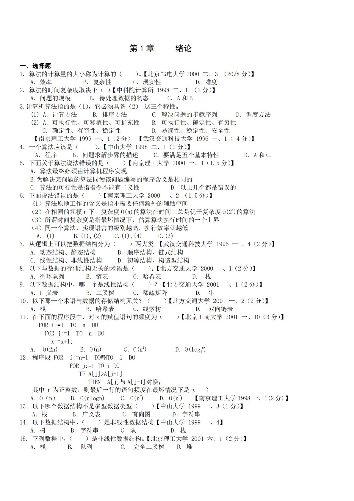 第1章绪论一、选择题1.算法的计算量的大小称为计算的()。【北京邮电大学2000二、3(20/8分)】A.效率B.复杂性C.现实性D.难度2.算法的时间复杂度取决于()【中科院计算所1998二、1(2分)】A.问题的规模B.待处理数据的初态C.A和B3.计算机算法指的是(1),它必须具备(2)这三个特性。(1)A.计算方法B.排序方法C.解决问题的步骤序列D.调度方法(2)A.可执行性、可移植性、可扩充性B.可执行性、确定性、有穷性C.确定性、有穷性、稳定性D.易读性、稳定性、安全性【南京理工大学1999一、1(2分)【武汉交通科技大学1996一、1(4分)】4.一个算法应该是()。【中山大学...