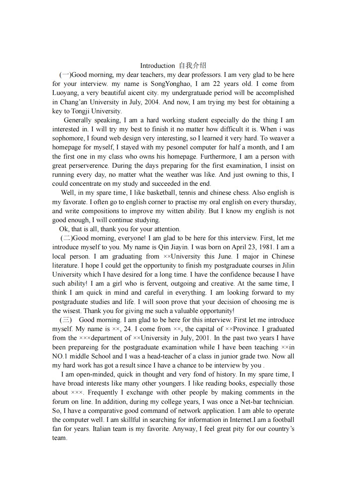 Introduction自我介绍(一)Goodmorning,mydearteachers,mydearprofessors.Iamverygladtobehereforyourinterview.mynameisSongYonghao,Iam22yearsold.IcomefromLuoyang,averybeautifulaicentcity.myundergratuadeperiodwillbeaccomplishedinChang’anUniversityinJuly,2004.Andnow,IamtryingmybestforobtainingakeytoTongjiUniversi...