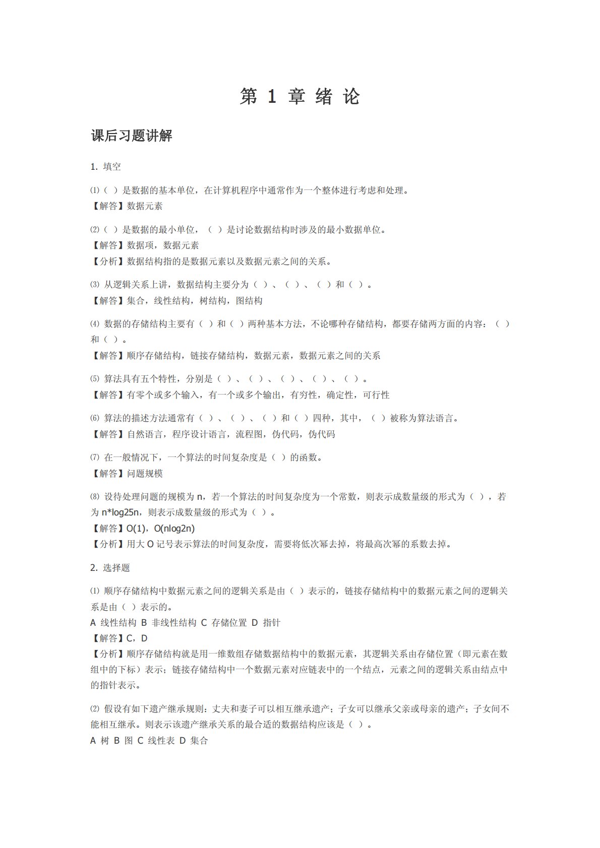 第1章绪论课后习题讲解1.填空⑴()是数据的基本单位,在计算机程序中通常作为一个整体进行考虑和处理。【解答】数据元素⑵()是数据的最小单位,()是讨论数据结构时涉及的最小数据单位。【解答】数据项,数据元素【分析】数据结构指的是数据元素以及数据元素之间的关系。⑶从逻辑关系上讲,数据结构主要分为()、()、()和()。【解答】集合,线性结构,树结构,图结构⑷数据的存储结构主要有()和()两种基本方法,不论哪种存储结构,都要存储两方面的内容:()和()。【解答】顺序存储结构,链接存储结构,数据元素,数据元素之间的关系⑸算法具有五个特性,分别是()、()、()、()、()。【解答】有零个或多个输入,有...