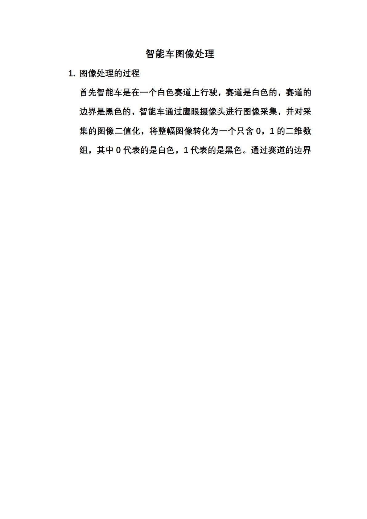 智能车图像处理1.图像处理的过程首先智能车是在一个白色\道上行驶,\道是白色的,\道的边界是黑色的,智能车通过鹰眼摄像头进行图像采集,并对采集的图像二值化,将整幅图像转化为一个只含0,1的二维数组,其中0代表的是白色,1代表的是黑色。通过\道的边界智能车图像处理1.图像处理的过程首先智能车是在一个白色\道上行驶,\道是白色的,\道的边界是黑色的,智能车通过鹰眼摄像头进行图像采集,并对采集的图像二值化,将整幅图像转化为一个只含0,1的二维数组,其中0代表的是白色,1代表的是黑色。通过\道的边界0,1的跳变来识别图像中的\道边界,然后根据\道边界求差拟合此时车子实际的中线,进而判断车子的实际位置,...