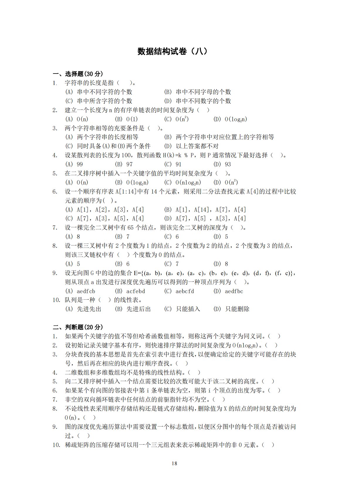 18数据结构试卷(八)一、选择题(30分)1.字符串的长度是指()。(A)串中不同字符的个数(B)串中不同字母的个数(C)串中所含字符的个数(D)串中不同数字的个数2.建立一个长度为n的有序单链表的时间复杂度为()(A)O(n)(B)O(1)(C)O(n2)(D)O(log2n)3.两个字符串相等的充要条件是()。(A)两个字符串的长度相等(B)两个字符串中对应位置上的字符相等(C)同时具备(A)和(B)两个条件(D)以上答案都不对4.设某散列表的长度为100,散列函数H(k)=k%P,则P通常情况下最好选择()。(A)99(B)97(C)91(D)935.在二叉排序树中插入一个关键字值的平均...