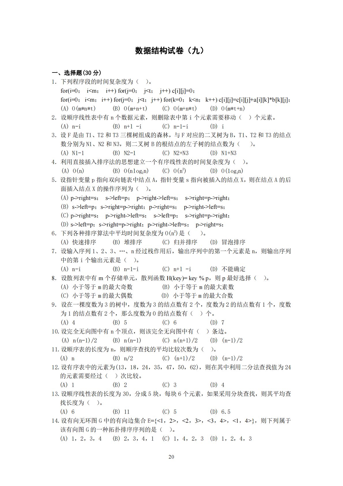 20数据结构试卷(九)一、选择题(30分)1.下列程序段的时间复杂度为()。for(i=0;iright=p->right;(B)s->left=p;s->right=p->right;p->right=s;p->right->left=s;(C)p->right=s;p->right->left=s;s->left=p;s->right=p->right;(D)s->left=p;s->right=p->right;p->right->left=s;p->right=s;6.下列各种排序算法中平均时间复杂度为O(n2)是()。(A)快速排序(B)堆排序(C)归并排序(D)冒泡排序7.设输入序...