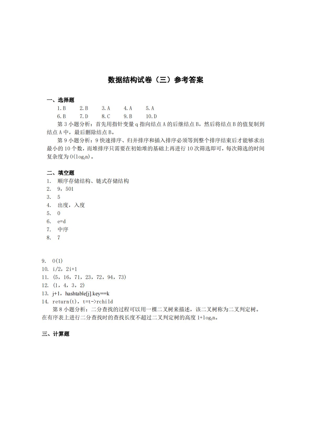 数据结构试卷(三)参考答案一、选择题1.B6.B2.B7.D3.A8.C4.A9.B5.A10.D第3小题分析:首先用指针变量q指向结点A的后继结点B,然后将结点B的值复制到结点A中,最后删除结点B。第9小题分析:9快速排序、归并排序和插入排序必须等到整个排序结束后才能够求出最小的10个数,而堆排序只需要在初始堆的基础上再进行10次筛选即可,每次筛选的时间复杂度为O(log2n)。二、填空题1.顺序存储结构、链式存储结构2.9,5013.54.出度,入度5.06.e=d7.中序8.7第8小题分析:二分查找的过程可以用一棵二叉树来描述,该二叉树称为二叉判定树。在有序表上进行二分查找时的查找长度不...