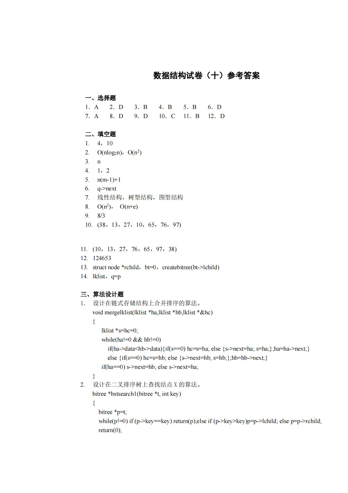 数据结构试卷(十)参考答案一、选择题4.B5.B1.A7.A2.D8.D3.B9.D10.C11.B6.D12.D二、填空题1.4,102.O(nlog2n),O(n2)3.n4.1,25.n(m-1)+16.q->next7.线性结构,树型结构,图型结构8.O(n2),O(n+e)9.8/310.(38,13,27,10,65,76,97)bitree*p=t;while(p!=0)if(p->key==key)return(p);elseif(p->key>key)p=p->lchild;elsep=p->rchild;bitree*bstsearch1(bitree*t,intkey)2...