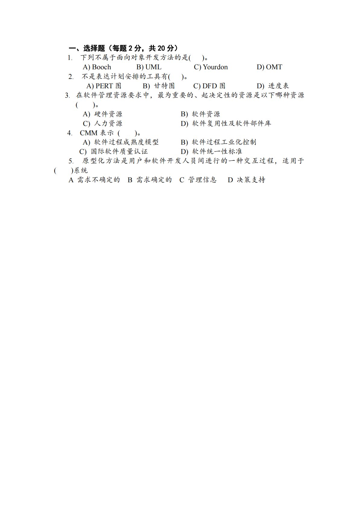 一、选择题(每题2分,共20分)1.下列不属于面向对象开发方法的是()。A)BoochB)UMLC)YourdonD)OMT2.不是表达计划安排的工具有()。A)PERT图B)甘特图C)DFD图D)进度表3.在软件管理资源要求中,最为重要的、起决定性的资源是以下哪种资源()。A)硬件资源B)软件资源C)人力资源D)软件复用性及软件部件库4.CMM表示()。A)软件过程成熟度模型B)软件过程工业化控制C)国际软件质量认证D)软件统一性标准5.原型化方法是用户和软件开发人员间进行的一种交互过程,适用于()系统A需求不确定的B需求确定的C管理信息D决策支持一、选择题(每题2分,共20分)1.下列不属...
