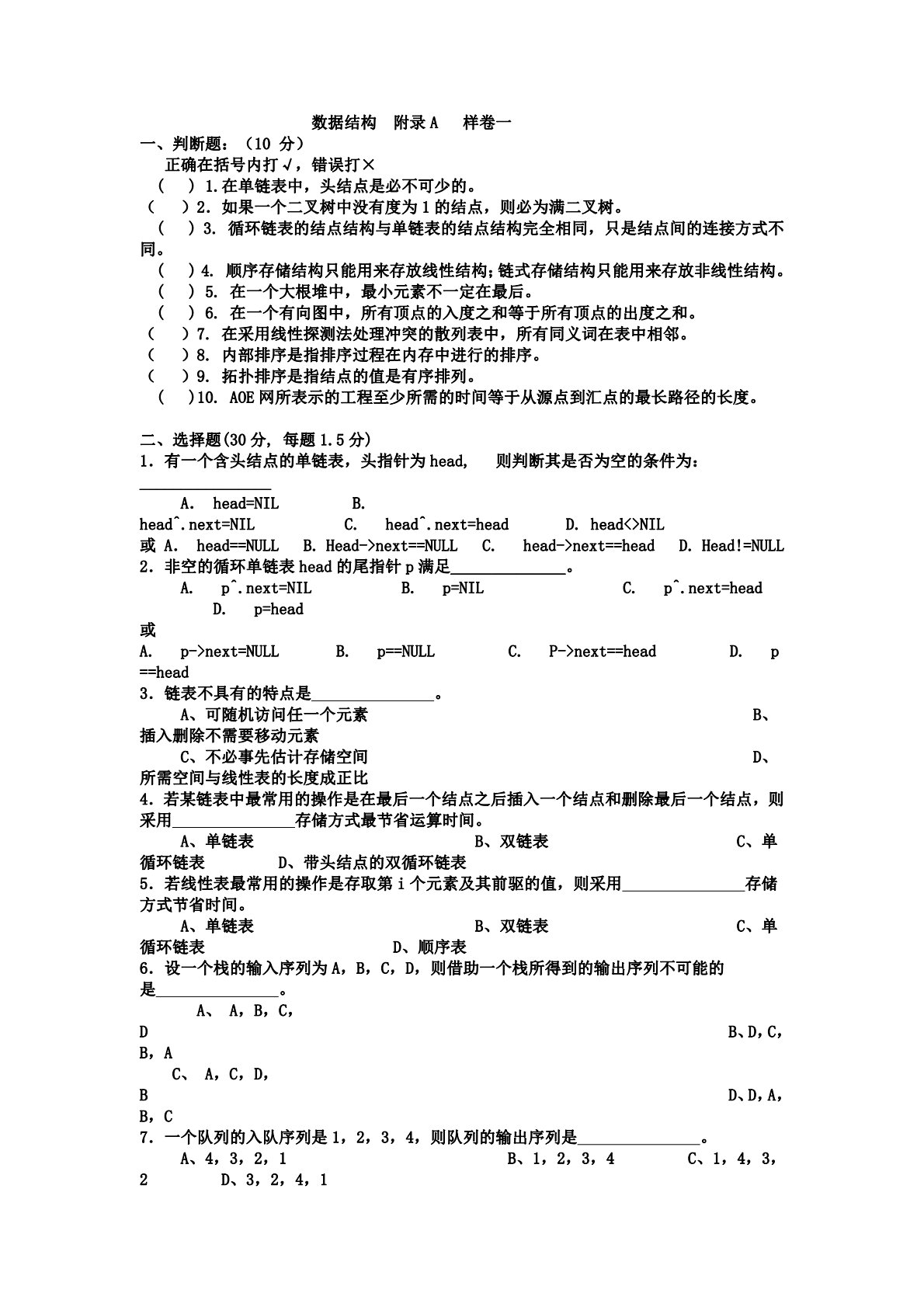 数据结构附录A样卷一一、判断题:(10分)正确在括号内打√,错误打×()1.在单链表中,头结点是必不可少的。()2.如果一个二叉树中没有度为1的结点,则必为满二叉树。()3.循环链表的结点结构与单链表的结点结构完全相同,只是结点间的连接方式不同。()4.顺序存储结构只能用来存放线性结构;链式存储结构只能用来存放非线性结构。()5.在一个大根堆中,最小元素不一定在最后。()6.在一个有向图中,所有顶点的入度之和等于所有顶点的出度之和。()7.在采用线性探测法处理冲突的散列表中,所有同义词在表中相邻。()8.内部排序是指排序过程在内存中进行的排序。()9.拓扑排序是指结点的值是有序排列。()10....