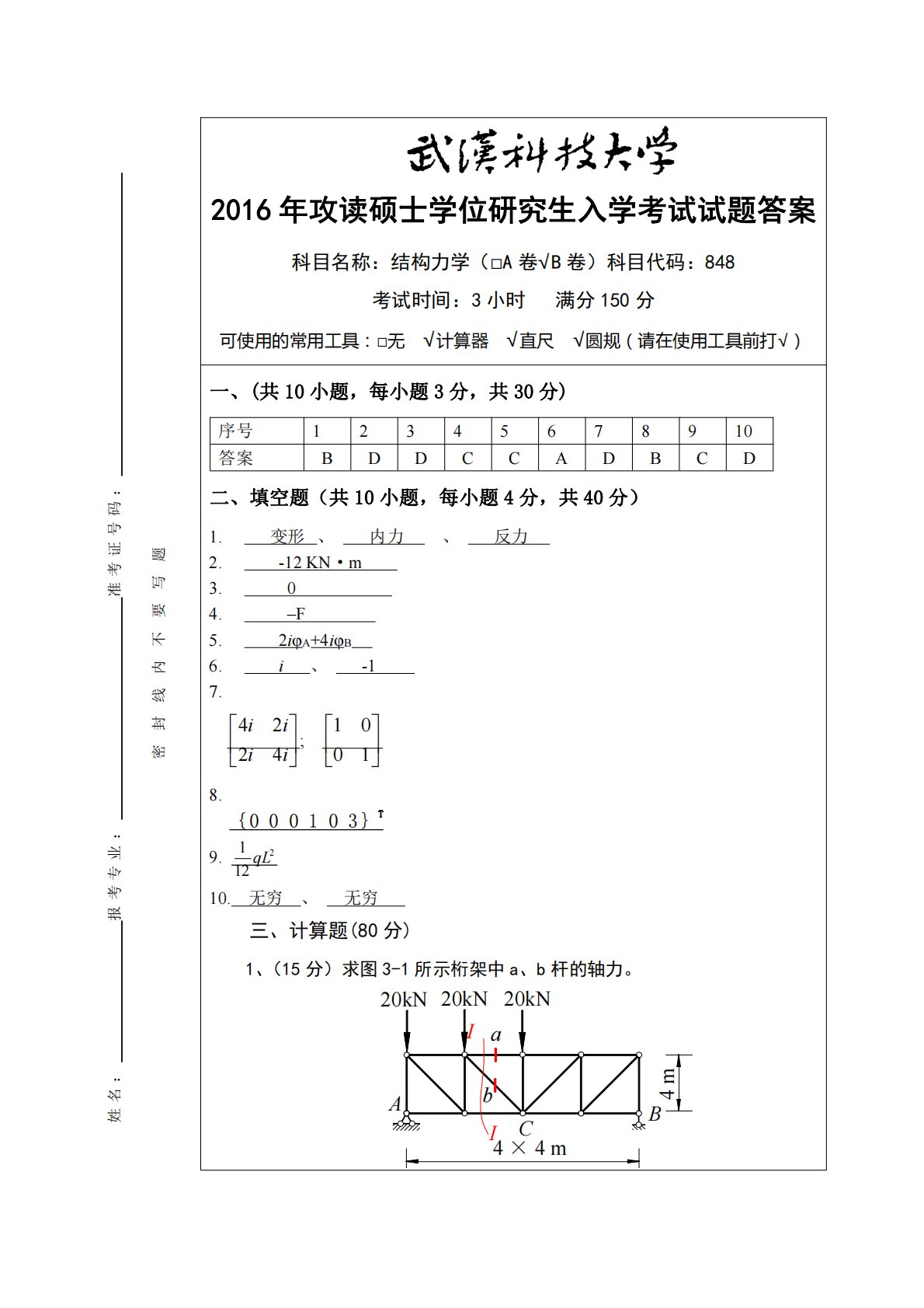 姓名:报考专业:准考证号码:密封线内不要写题2016年攻读硕士学位研究生入学考试试题答案科目名称:结构力学(□A卷√B卷)科目代码:848考试时间:3小时满分150分可使用的常用工具:□无√计算器√直尺√圆规(请在使用工具前打√)一、(共10小题,每小题3分,共30分)序号12345678910答案BDDCCADBCD二、填空题(共10小题,每小题4分,共40分)1.变形、内力、反力2.-12KN·m3.04.–F5.2iφA+4iφB6.i、-17.iiii4224;10018.{000103}T9.2112qL10.无穷、无穷三、计算题(80分)1、(15分)求图3...