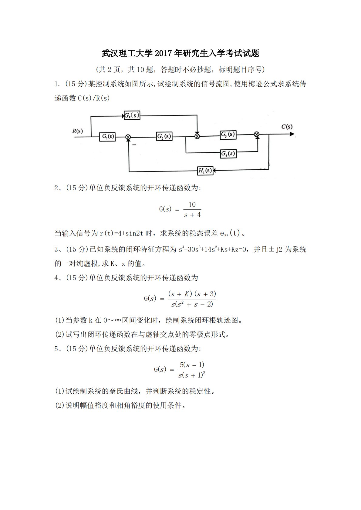 武汉理工大学2017年研究生入学考试试题(共2页,共10题,答题时不必抄题,标明题目序号)1.(15分)某控制系统如图所示,试绘制系统的信号流图,使用梅逊公式求系统传递函数C(s)/R(s)2、(15分)单位负反馈系统的开环传递函数为:ss=+G()104当输入信号为r(t)=4+sin2t时,求系统的稳态误差ess(t)。3、(15分)已知系统的闭环特征方程为s4+30s3+14s2+Ks+Kz=0,并且±j2为系统的一对纯虛根,求K、z的值。4、(15分)单位负反馈系统的开环传递函数为ssKssss=+++−2G()()(3)(2)(1)当参数k在0~∞区间变化时,绘制系统闭环根轨迹图。(...