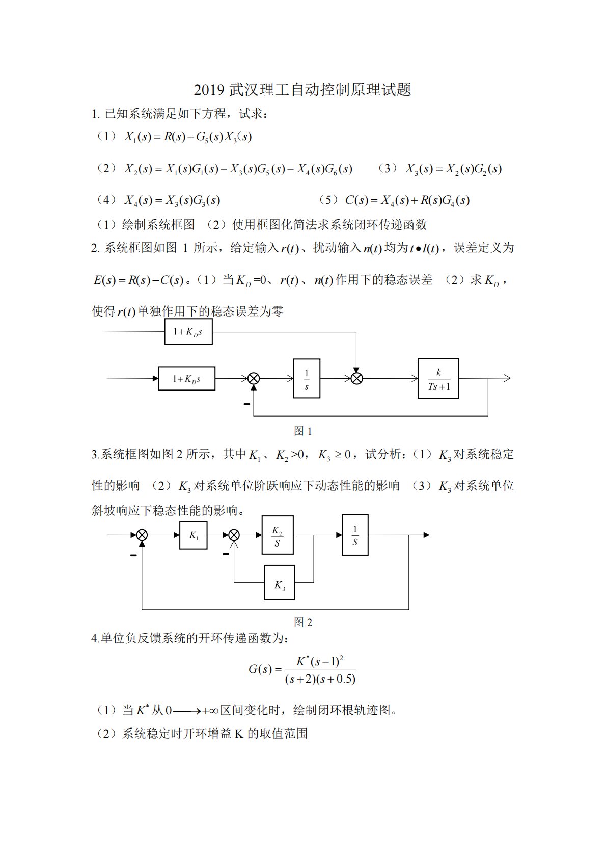 2019武汉理工自动控制原理试题1.已知系统满足如下方程,试求:(1)=−(XsRsGsXs153()()())(2)=−−XsXsGsXsGsXsGs2113546()()()()()()()(3)=XsXsGs322()()()(4)=XsXsGs433()()()(5)=+CsXsRsGs44()()()()(1)绘制系统框图(2)使用框图化简法求系统闭环传递函数2.系统框图如图1所示,给定输入rt()、扰动输入nt()均为•tlt(),误差定义为=−EsRsCs()()()。(1)当KD=0、rt()、nt()作用下的稳态误差(2)求KD,使得rt()单独作用下的稳态误差为零图13.系...