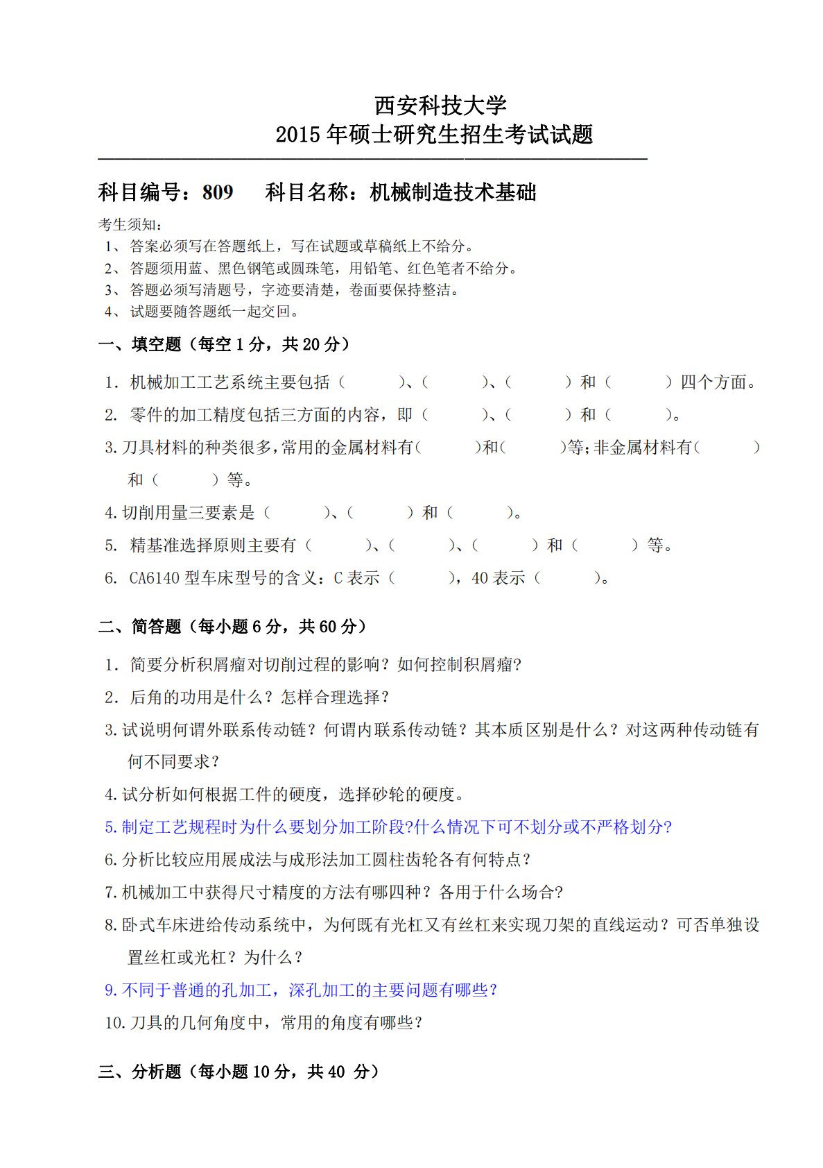 西安科技大学2015年硕士研究生招生考试试题─────────────────────────────────科目编号:809科目名称:机械制造技术基础考生须知:1、答案必须写在答题纸上,写在试题或草稿纸上不给分。2、答题须用蓝、黑色钢笔或圆珠笔,用铅笔、红色笔者不给分。3、答题必须写清题号,字迹要清楚,卷面要保持整洁。4、试题要随答题纸一起交回。一、填空题(每空1分,共20分)1.机械加工工艺系统主要包括()、()、()和()四个方面。2.零件的加工精度包括三方面的内容,即()、()和()。3.刀具材料的种类很多,常用的金属材料有()和()等;非金属材料有()和()等。4.切削用量三要素是(...