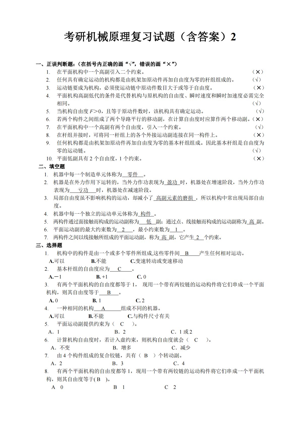考研机械原理复习试题(含答案)2一、正误判断题:(在括号内正确的画“√”,错误的画“×”)1.在平面机构中一个高副引入二个约束。(×)2.任何具有确定运动的机构都是由机架加原动件再加自由度为零的杆组组成的。(√)3.运动链要成为机构,必须使运动链中原动件数目大于或等于自由度。(×)4.平面机构高副低代的条件是代替机构与原机构的自由度、瞬时速度和瞬时加速度必需完全相同。(√)5.当机构自由度F>0,且等于原动件数时,该机构具有确定运动。(√)6.若两个构件之间组成了两个导路平行的移动副,在计算自由度时应算作两个移动副。(×)7.在平面机构中一个高副有两个自由度,引入一个约束。(√)8.在杆组并接...