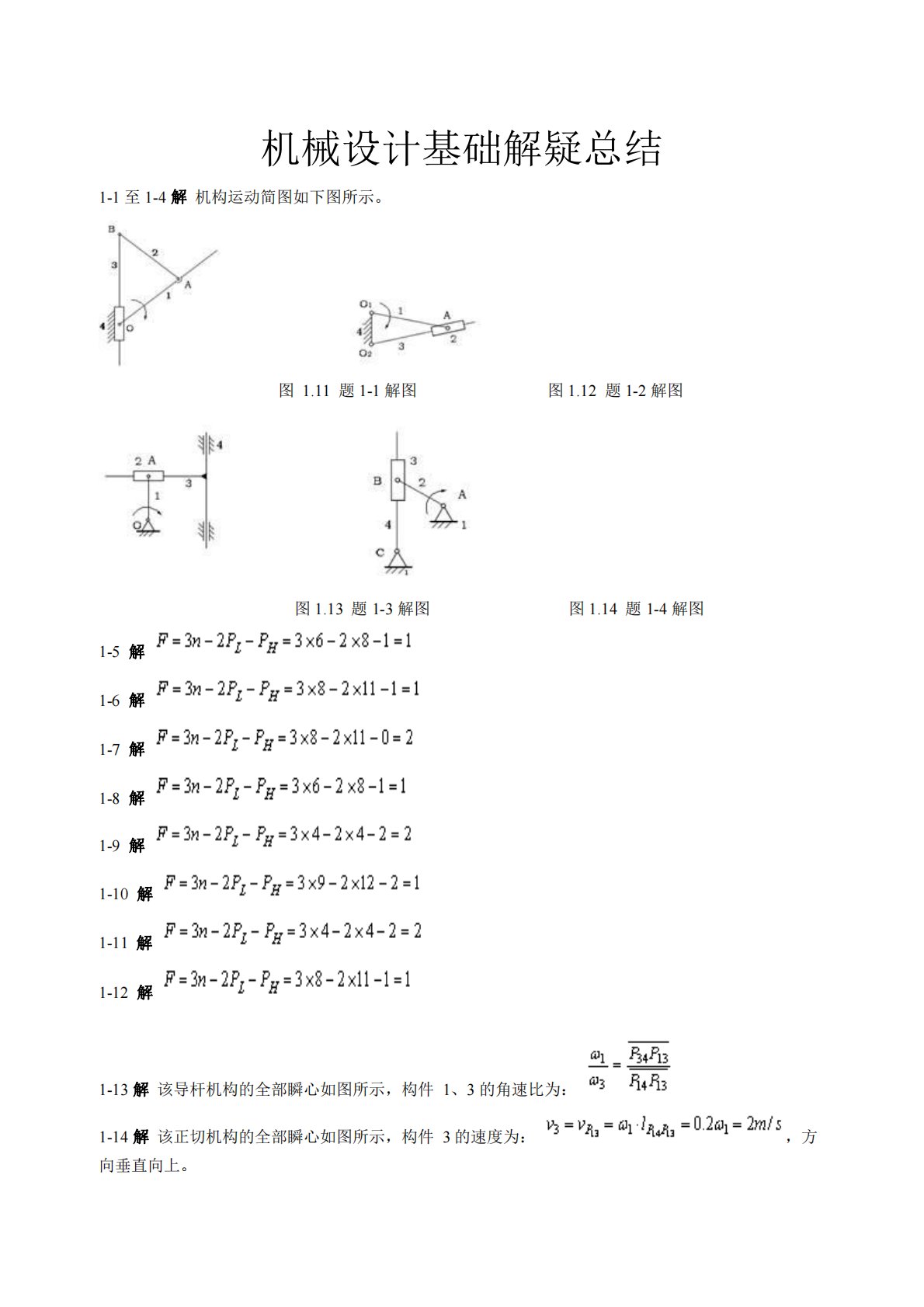 机械设计基础解疑总结1-1至1-4解机构运动简图如下图所示。图1.11题1-1解图图1.12题1-2解图图1.13题1-3解图图1.14题1-4解图1-5解1-6解1-7解1-8解1-9解1-10解1-11解1-12解1-13解该导杆机构的全部瞬心如图所示,构件1、3的角速比为:1-14解该正切机构的全部瞬心如图所示,构件3的速度为:,方向垂直向上。1-15解要求轮1与轮2的角速度之比,首先确定轮1、轮2和机架4三个构件的三个瞬心,即,和,如图所示。则:,轮2与轮1的转向相反。1-16解(1)图a中的构件组合的自由度为:自由度为零,为一刚性桁架,所以构件之间不能产生相对运动。(2)图b中的CD...