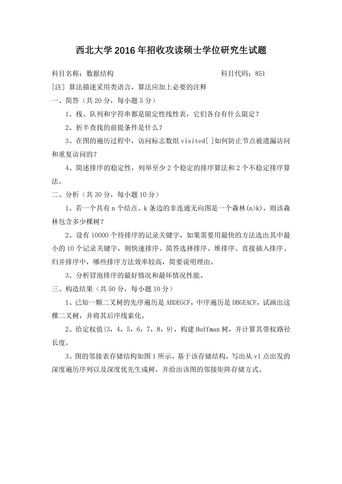 西北大学2016年招收攻读硕士学位研究生试题科目名称:数据结构科目代码:851[注]算法描述采用类语言,算法应加上必要的注释一、简答(共20分,每小题5分)1、栈、队列和字符串都是限定性线性表,它们各自有什么限定?2、折半查找的前提条件是什么?3、在图的遍历过程中,访问标志数组visited[]如何防止节点被遗漏访问和重复访问的?4、简述排序的稳定性,列举至少2个稳定的排序算法和2个不稳定排序算法。二、分析(共30分,每小题10分)1、若一个具有n个结点、k条边的非连通无向图是一个森林(n>k),则该森林包含多少棵树?2、设有10000个待排序的记录关键字,如果需要用最快的方法选出其中最小的1...