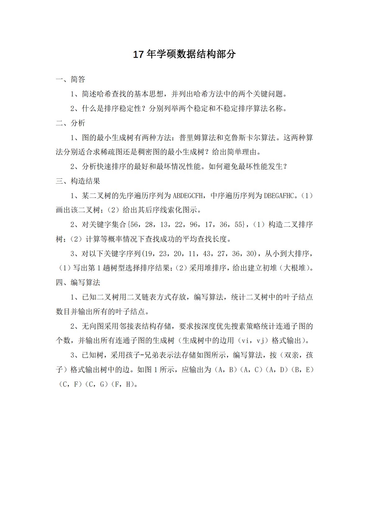 17年学硕数据结构部分一、简答1、简述哈希查找的基本思想,并列出哈希方法中的两个关键问题。2、什么是排序稳定性?分别列举两个稳定和不稳定排序算法名称。二、分析1、图的最小生成树有两种方法:普里姆算法和克鲁斯卡尔算法。这两种算法分别适合求稀疏图还是稠密图的最小生成树?给出简单理由。2、分析快速排序的最好和最坏情况性能。如何避免最坏性能发生?三、构造结果1、某二叉树的先序遍历序列为ABDEGCFH,中序遍历序列为DBEGAFHC。(1)画出该二叉树;(2)给出其后序线索化图示。2、对关键字集合{56,28,13,22,96,17,36,55},(1)构造二叉排序树;(2)计算等概率情况下查找成功的...