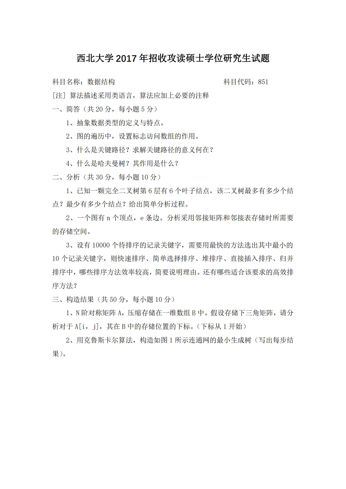 西北大学2017年招收攻读硕士学位研究生试题科目名称:数据结构科目代码:851[注]算法描述采用类语言,算法应加上必要的注释一、简答(共20分,每小题5分)1、抽象数据类型的定义与特点。2、图的遍历中,设置标志访问数组的作用。3、什么是关键路径?求解关键路径的意义何在?4、什么是哈夫曼树?其作用是什么?二、分析(共30分,每小题10分)1、已知一颗完全二叉树第6层有6个叶子结点,该二叉树最多有多少个结点?最少有多少个结点?给出简单分析过程。2、一个图有n个顶点,e条边。分析采用邻接矩阵和邻接表存储时所需要的存储空间。3、设有10000个待排序的记录关键字,需要用最快的方法选出其中最小的10个记...