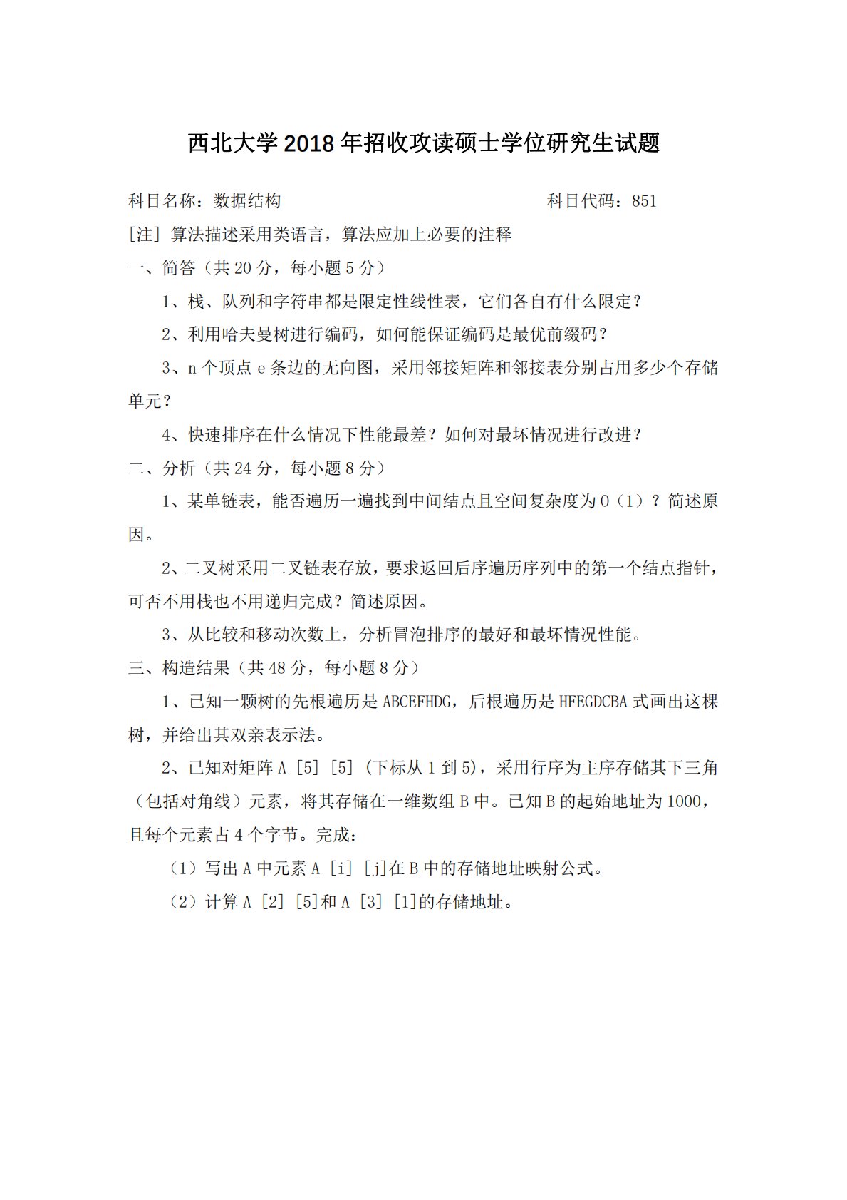 西北大学2018年招收攻读硕士学位研究生试题科目名称:数据结构科目代码:851[注]算法描述采用类语言,算法应加上必要的注释一、简答(共20分,每小题5分)1、栈、队列和字符串都是限定性线性表,它们各自有什么限定?2、利用哈夫曼树进行编码,如何能保证编码是最优前缀码?3、n个顶点e条边的无向图,采用邻接矩阵和邻接表分别占用多少个存储单元?4、快速排序在什么情况下性能最差?如何对最坏情况进行改进?二、分析(共24分,每小题8分)1、某单链表,能否遍历一遍找到中间结点且空间复杂度为O(1)?简述原因。2、二叉树采用二叉链表存放,要求返回后序遍历序列中的第一个结点指针,可否不用栈也不用递归完成?简述...
