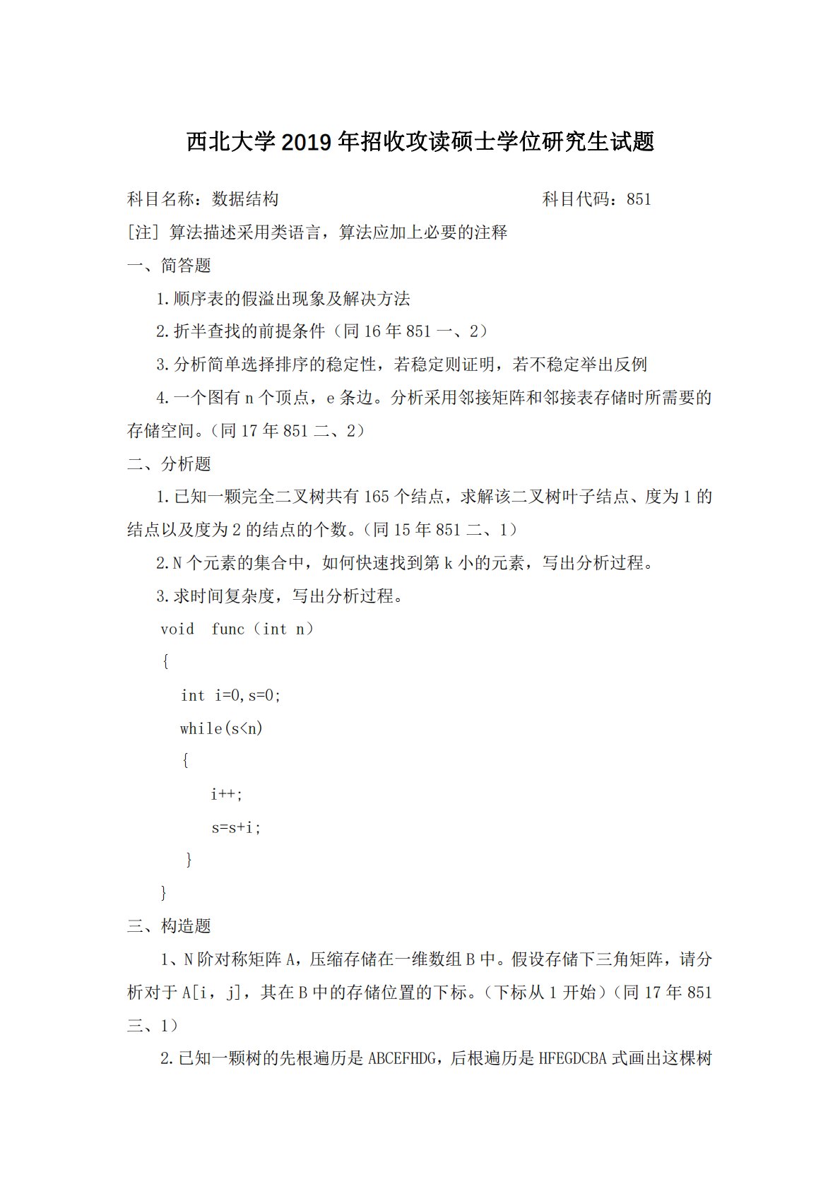 西北大学2019年招收攻读硕士学位研究生试题科目名称:数据结构科目代码:851[注]算法描述采用类语言,算法应加上必要的注释一、简答题1.顺序表的假溢出现象及解决方法2.折半查找的前提条件(同16年851一、2)3.分析简单选择排序的稳定性,若稳定则证明,若不稳定举出反例4.一个图有n个顶点,e条边。分析采用邻接矩阵和邻接表存储时所需要的存储空间。(同17年851二、2)二、分析题1.已知一颗完全二叉树共有165个结点,求解该二叉树叶子结点、度为1的结点以及度为2的结点的个数。(同15年851二、1)2.N个元素的集合中,如何快速找到第k小的元素,写出分析过程。3.求时间复杂度,写出分析过程。...