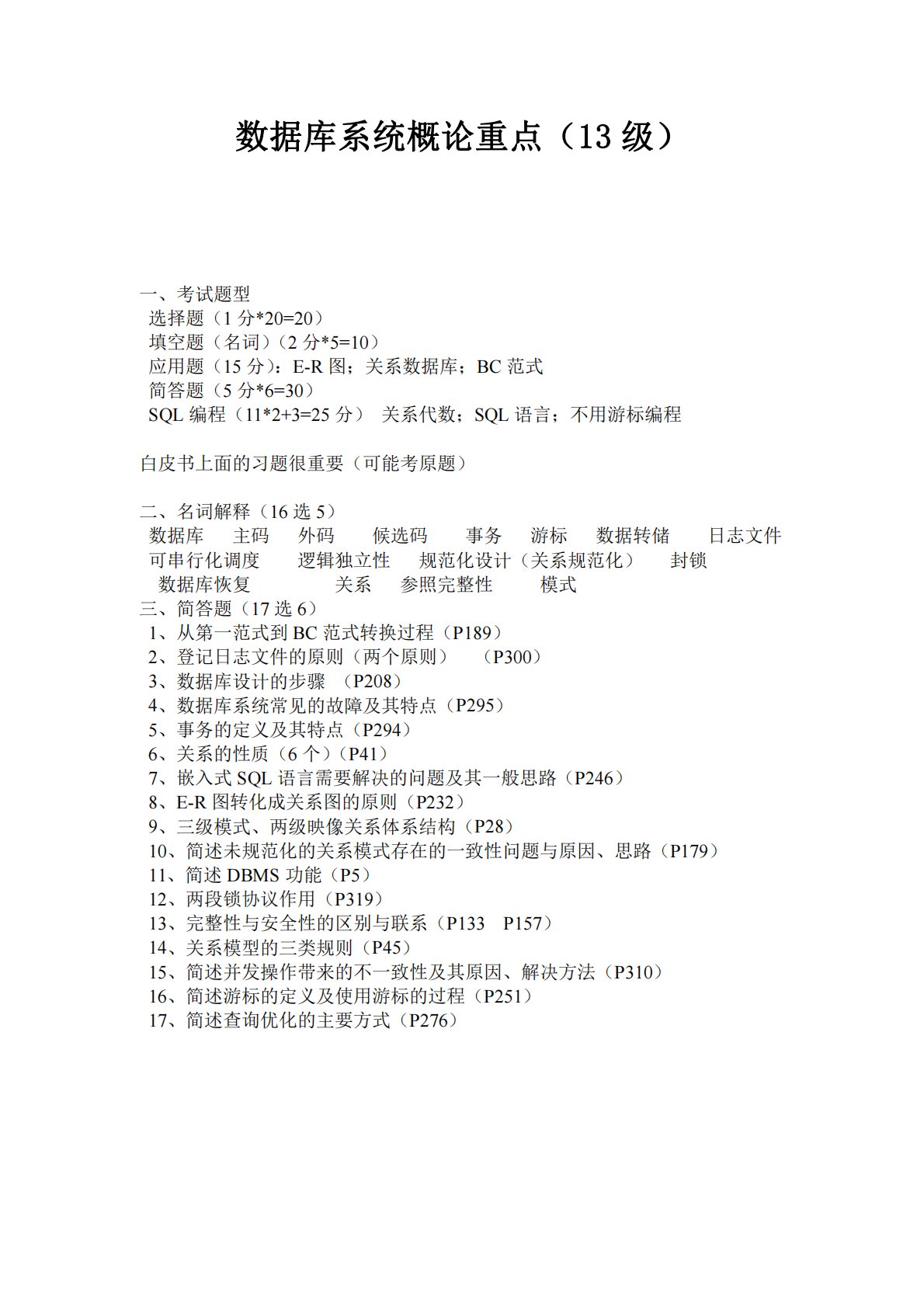 数据库系统概论重点(13级)一、考试题型选择题(1分*20=20)填空题(名词)(2分*5=10)应用题(15分):E-R图;关系数据库;BC范式简答题(5分*6=30)SQL编程(11*2+3=25分)关系代数;SQL语言;不用游标编程白皮书上面的习题很重要(可能考原题)二、名词解释(16选5)数据库主码外码候选码事务游标数据转储日志文件可串行化调度逻辑独立性规范化设计(关系规范化)封锁数据库恢复关系参照完整性模式三、简答题(17选6)1、从第一范式到BC范式转换过程(P189)2、登记日志文件的原则(两个原则)(P300)3、数据库设计的步骤(P208)4、数据库系统常见的故障及其特点(P...