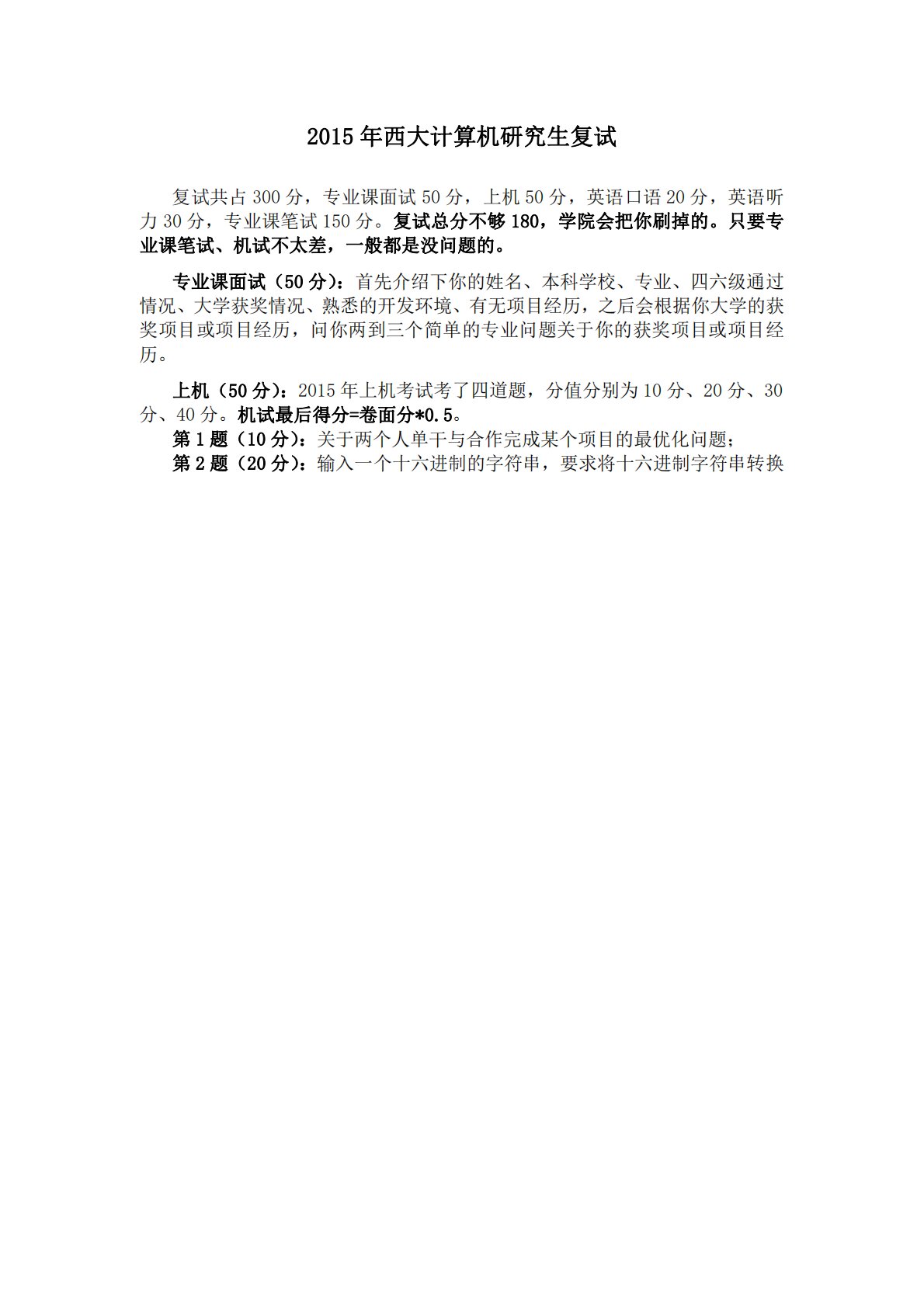 2015年西大计算机研究生复试复试共占300分,专业课面试50分,上机50分,英语口语20分,英语听力30分,专业课笔试150分。复试总分不够180,学院会把你刷掉的。只要专业课笔试、机试不太差,一般都是没问题的。专业课面试(50分):首先介绍下你的姓名、本科学校、专业、四六级通过情况、大学获奖情况、熟悉的开发环境、有无项目经历,之后会根据你大学的获奖项目或项目经历,问你两到三个简单的专业问题关于你的获奖项目或项目经历。上机(50分):2015年上机考试考了四道题,分值分别为10分、20分、30分、40分。机试最后得分=卷面分*0.5。第1题(10分):关于两个人单干与合作完成某个项目的最优化...