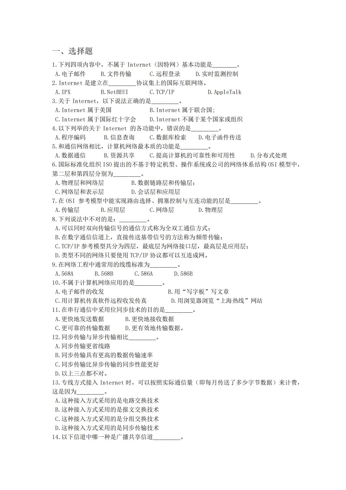 一、选择题1.下列四项内容中,不属于Internet(因特网)基本功能是________。A.电子邮件B.文件传输C.远程登录D.实时监测控制2.Internet是建立在_________协议集上的国际互联网络。A.IPXB.NetBEUIC.TCP/IPD.AppleTalk3.关于Internet,以下说法正确的是_________。A.Internet属于美国B.Internet属于联合国;C.Internet属于国际红十字会D.Internet不属于某个国家或组织4.以下列举的关于Internet的各功能中,错误的是_________。A.程序编码B.信息查询C.数据库检索D.电子函件...