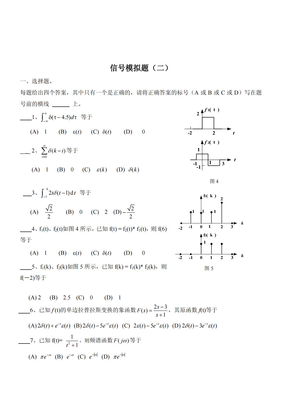 图7、已知t(D)t(C)tt,其原函数f(t)s(A)2(B)2.5(C)0(D)16、已知f(t)的单边拉普拉斯变换的象函数F(s)s231等于(A)2()()tet(B)2()5()tet2()5()tet2()3()tetf(t)=,则频谱函数F(j21t1)等于(A)e(B)e(C)e一、选择题。每题给出四个答案,其中只有一个是正确的,请将正确答案的标号(A或B或C或D信号模拟题(二))写在题号前的横线上。(A)3、9k(D)(A)1(B)0(C)___2、it等于t(C)(A)1(B)1、()d...