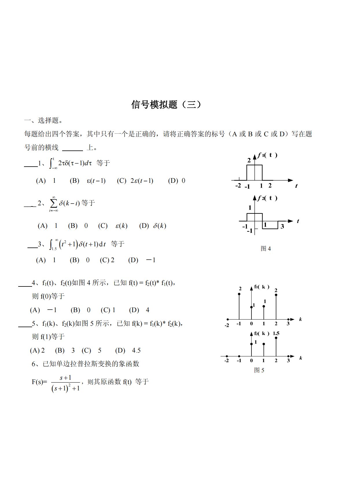 F(s)=6(A)2(B)3(C)5(D)4.5则f(1)(A)-1(B)0(C)1(D)45、f1(k)、f2(k)如图5所示,已知f(k)=f1(k)*f2(k)则f(0)4、f1(t)、f2(t)如图4所示,已知f(t)=f2(t)*f1(t),等于,等于、已知单边拉普拉斯变换的象函数,则其原函数f(t)s211s1等于信号模拟题(三)一、选择题。每题给出四个答案,其中只有一个是正确的,请将正确答案的标号(A或B或C或D)写在题号前的横线上。()dt1、等于t(A)1(B)(1)t(1)(C)(D)0ki()i___2、等于(A)1(...