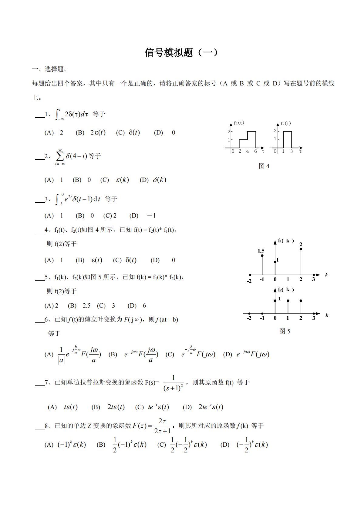 信号模拟题(一)一、选择题。每题给出四个答案,其中只有一个是正确的,请将正确答案的标号(A或B或C或D)写在题号前的横线上。()dt1、等于(A)2(B)2()t(C)()t(D)0(4)i2、i等于(A)1(B)0(C)()kk(D)()0ett2t(1)d33、等于(A)1(B)0(C)2(D)-14、f1(t)、f2(t)如图4所示,已知f(t)=f2(t)*f1(t),则f(2)等于(A)1(B)()t(C)()t(D)05、f1(k)、f2(k)如图5所示,已知f(k)=f1(k)*f2(k),则f(2)等于(A)2(B)2.5(C)3...