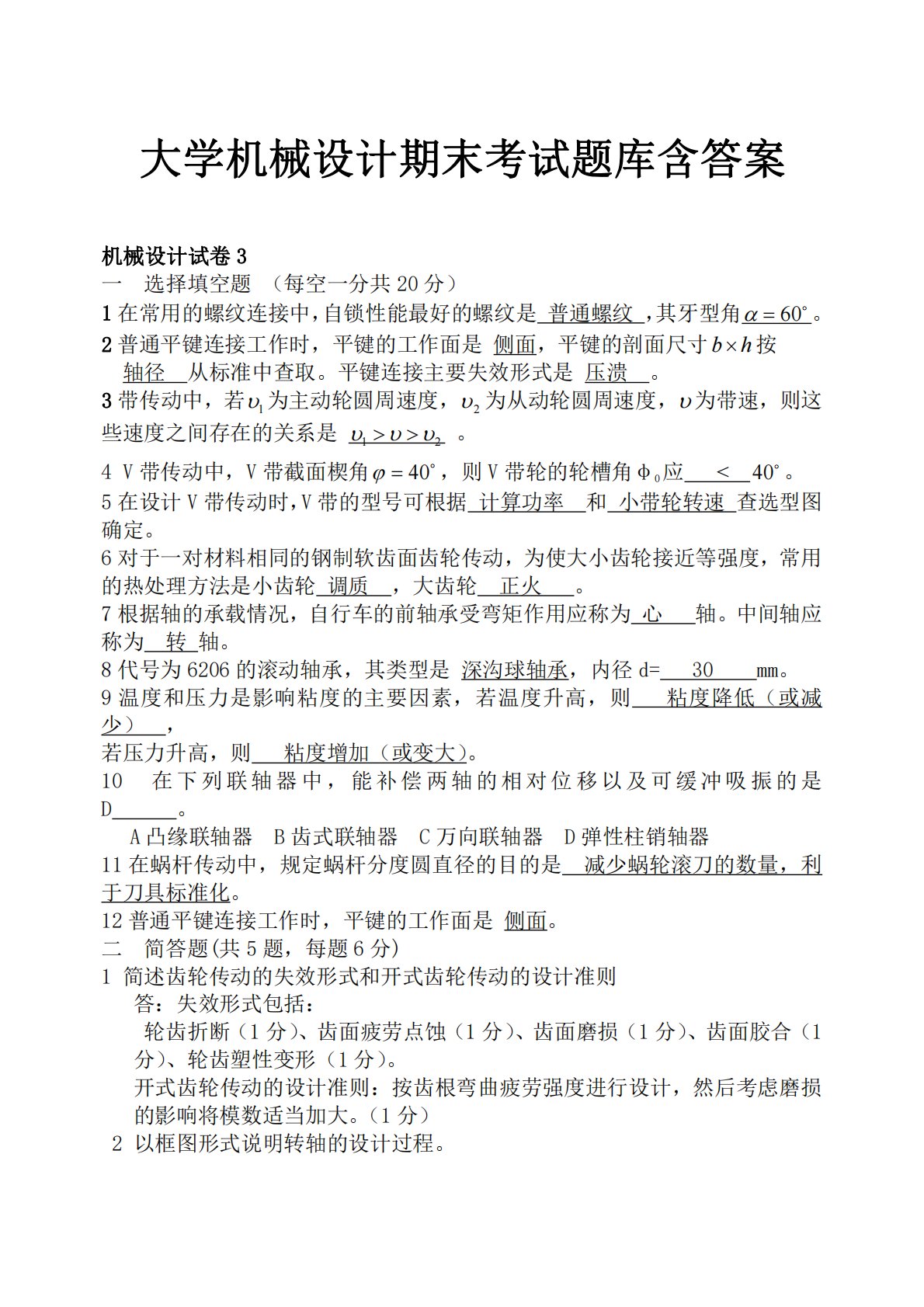 大学机械设计期末考试题库含答案机械设计试卷3一选择填空题(每空一分共20分)1在常用的螺纹连接中,自锁性能最好的螺纹是普通螺纹,其牙型角60。2普通平键连接工作时,平键的工作面是侧面,平键的剖面尺寸bh按轴径从标准中查取。平键连接主要失效形式是压溃。3带传动中,若1为主动轮圆周速度,2为从动轮圆周速度,为带速,则这些速度之间存在的关系是12。4V带传动中,V带截面楔角40,则V带轮的轮槽角φ0应<40。5在设计V带传动时,V带的型号可根据计算功率和小带轮转速查选型图确定。6对于一对材料相同的钢制软齿面齿轮传动,为使大小齿轮接近等强度,常用的热处理方法是小齿轮调质...