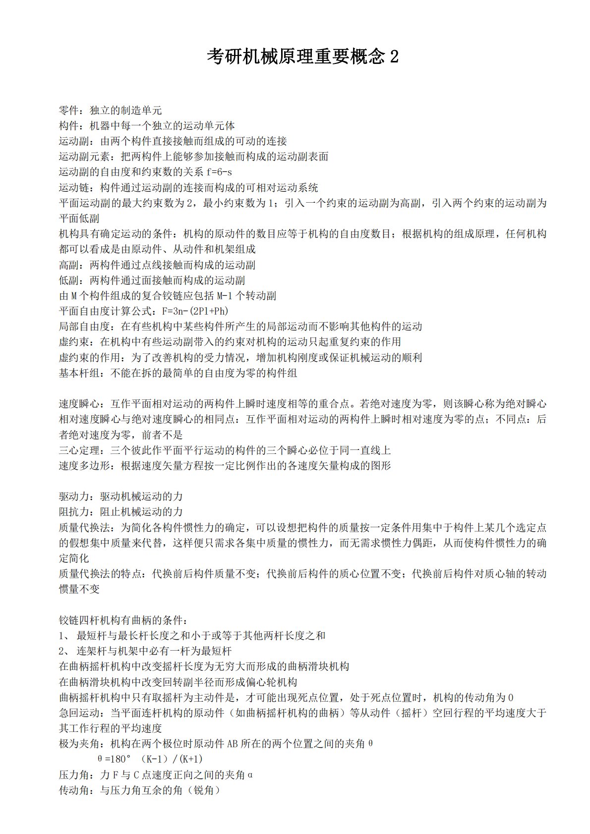 考研机械原理重要概念2零件:独立的制造单元构件:机器中每一个独立的运动单元体运动副:由两个构件直接接触而组成的可动的连接运动副元素:把两构件上能够参加接触而构成的运动副表面运动副的自由度和约束数的关系f=6-s运动链:构件通过运动副的连接而构成的可相对运动系统平面运动副的最大约束数为2,最小约束数为1;引入一个约束的运动副为高副,引入两个约束的运动副为平面低副机构具有确定运动的条件:机构的原动件的数目应等于机构的自由度数目;根据机构的组成原理,任何机构都可以看成是由原动件、从动件和机架组成高副:两构件通过点线接触而构成的运动副低副:两构件通过面接触而构成的运动副由M个构件组成的复合铰链应包括M...