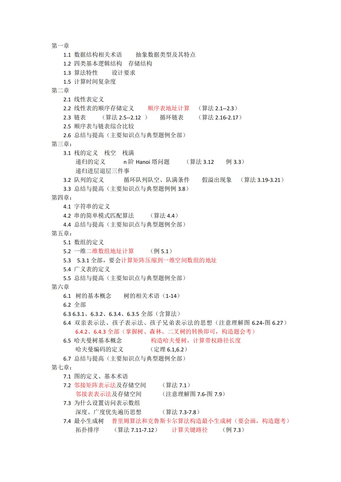 第一章1.1数据结构相关术语抽象数据类型及其特点1.2四类基本逻辑结构存储结构1.3算法特性设计要求1.5计算时间复杂度第二章2.1线性表定义2.2线性表的顺序存储定义顺序表地址计算(算法2.1--2.3)2.3链表(算法2.5--2.12)循环链表(算法2.16-2.17)2.5顺序表与链表综合比较2.6总结与提高(主要知识点与典型题例全部)第三章:3.1栈的定义栈空栈满递归的定义n阶Hanoi塔问题(算法3.12例3.3)递归进层退层三件事3.2队列的定义循环队列队空、队满条件假溢出现象(算法3.19-3.21)3.3总结与提高(主要知识点与典型题例例3.8)第四章:4.1字符串的定义4....