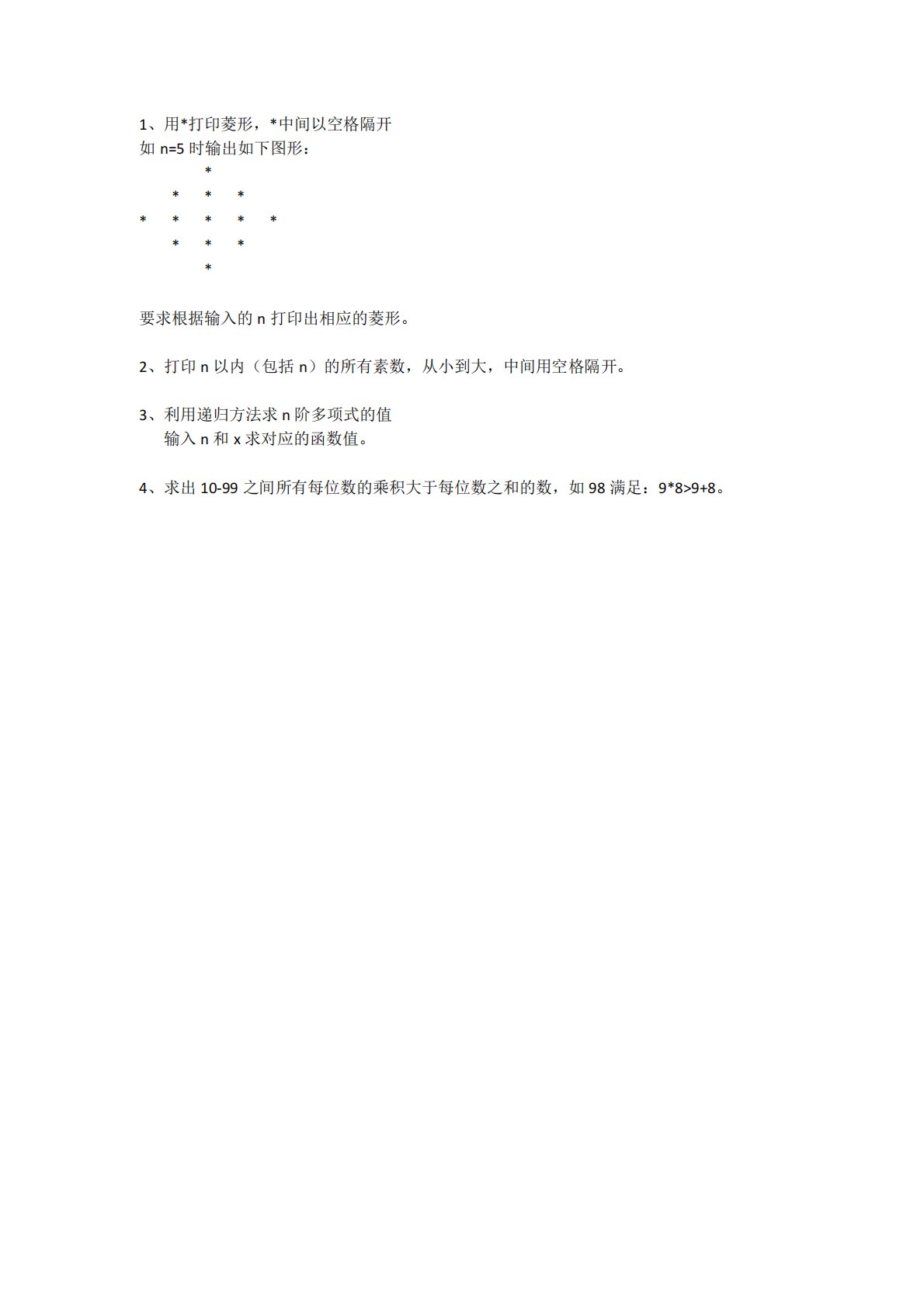 1、用*打印菱形,*中间以空格隔开如n=5时输出如下图形:*************要求根据输入的n打印出相应的菱形。2、打印n以内(包括n)的所有素数,从小到大,中间用空格隔开。3、利用递归方法求n阶多项式的值输入n和x求对应的函数值。4、求出10-99之间所有每位数的乘积大于每位数之和的数,如98满足:9*8>9+8。1、用*打印菱形,*中间以空格隔开如n=5时输出如下图形:*************要求根据输入的n打印出相应的菱形。2、打印n以内(包括n)的所有素数,从小到大,中间用空格隔开。3、利用递归方法求n阶多项式的值输入n和x求对应的函数值。4、求出10-99之间所有每位数的乘积...