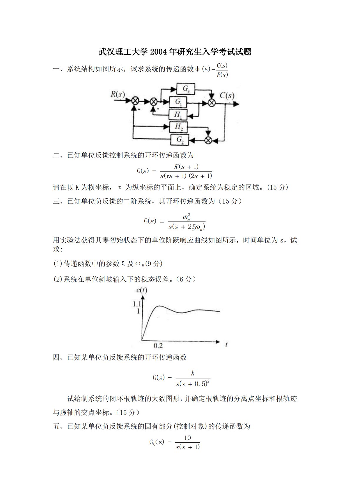 武汉理工大学2004年研究生入学考试试题一、系统结构如图所示,试求系统的传递函数φ(s)=sRsC()()二、已知单位反馈控制系统的开环传递函数为sKssss=+++G()(1)(1)(21)请在以K为横坐标,τ为纵坐标的平面上,确定系统为稳定的区域。(15分)三、已知单位负反馈的二阶系统,其开环传递函数为(15分)=+sssnn2G()(2)用实验法获得其零初始状态下的单位阶跃响应曲线如图所示,时间单位为s,试求:(1)传递函数中的参数ζ及ωn(9分)(2)系统在单位斜坡输入下的稳态误差。(6分)四、已知某单位负反馈系统的开环传递函数skss=+G()(0.5)2试绘制系统的闭环根轨...