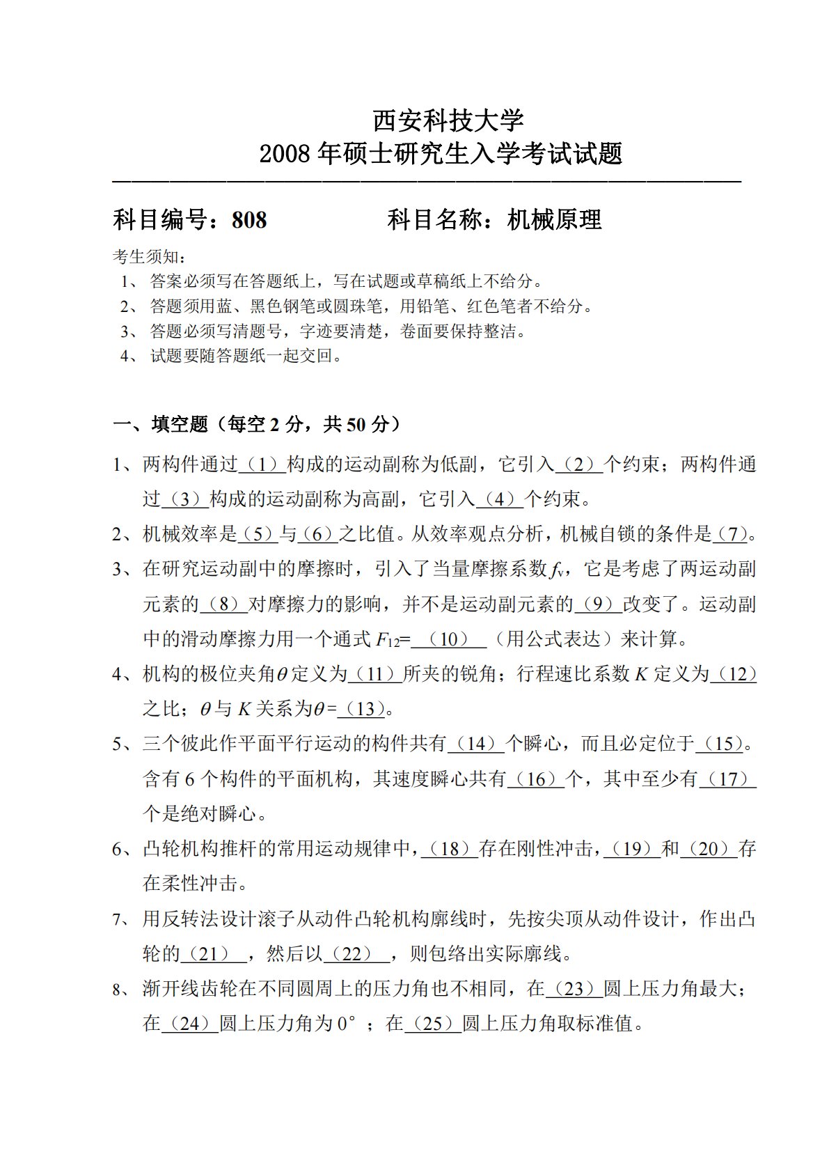 西安科技大学2008年硕士研究生入学考试试题─────────────────────────────────科目编号:808科目名称:机械原理考生须知:1、答案必须写在答题纸上,写在试题或草稿纸上不给分。2、答题须用蓝、黑色钢笔或圆珠笔,用铅笔、红色笔者不给分。3、答题必须写清题号,字迹要清楚,卷面要保持整洁。4、试题要随答题纸一起交回。一、填空题(每空2分,共50分)1、两构件通过(1)构成的运动副称为低副,它引入(2)个约束;两构件通过(3)构成的运动副称为高副,它引入(4)个约束。2、机械效率是(5)与(6)之比值。从效率观点分析,机械自锁的条件是(7)。3、在研究运动副中的摩擦时,引...