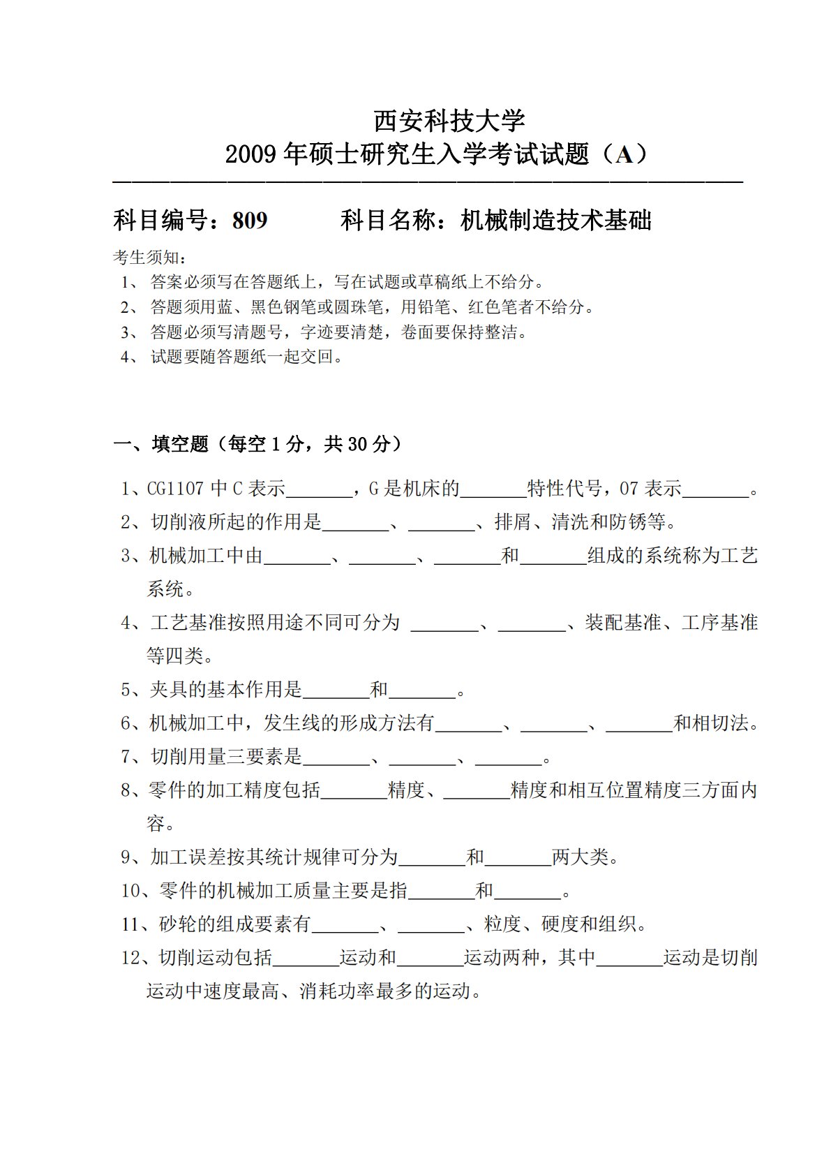 西安科技大学2009年硕士研究生入学考试试题(A)─────────────────────────────────科目编号:809科目名称:机械制造技术基础考生须知:1、答案必须写在答题纸上,写在试题或草稿纸上不给分。2、答题须用蓝、黑色钢笔或圆珠笔,用铅笔、红色笔者不给分。3、答题必须写清题号,字迹要清楚,卷面要保持整洁。4、试题要随答题纸一起交回。一、填空题(每空1分,共30分)1、CG1107中C表示,G是机床的特性代号,07表示。2、切削液所起的作用是、、排屑、清洗和防锈等。3、机械加工中由、、和组成的系统称为工艺系统。4、工艺基准按照用途不同可分为、、装配基准、工序基准等四类。5、...