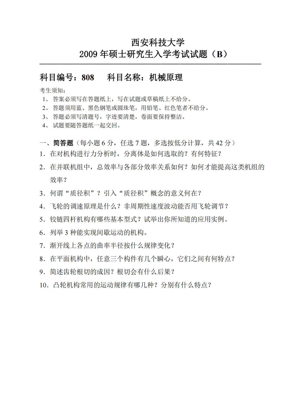 西安科技大学809机械设计基础2009年考研真题B卷