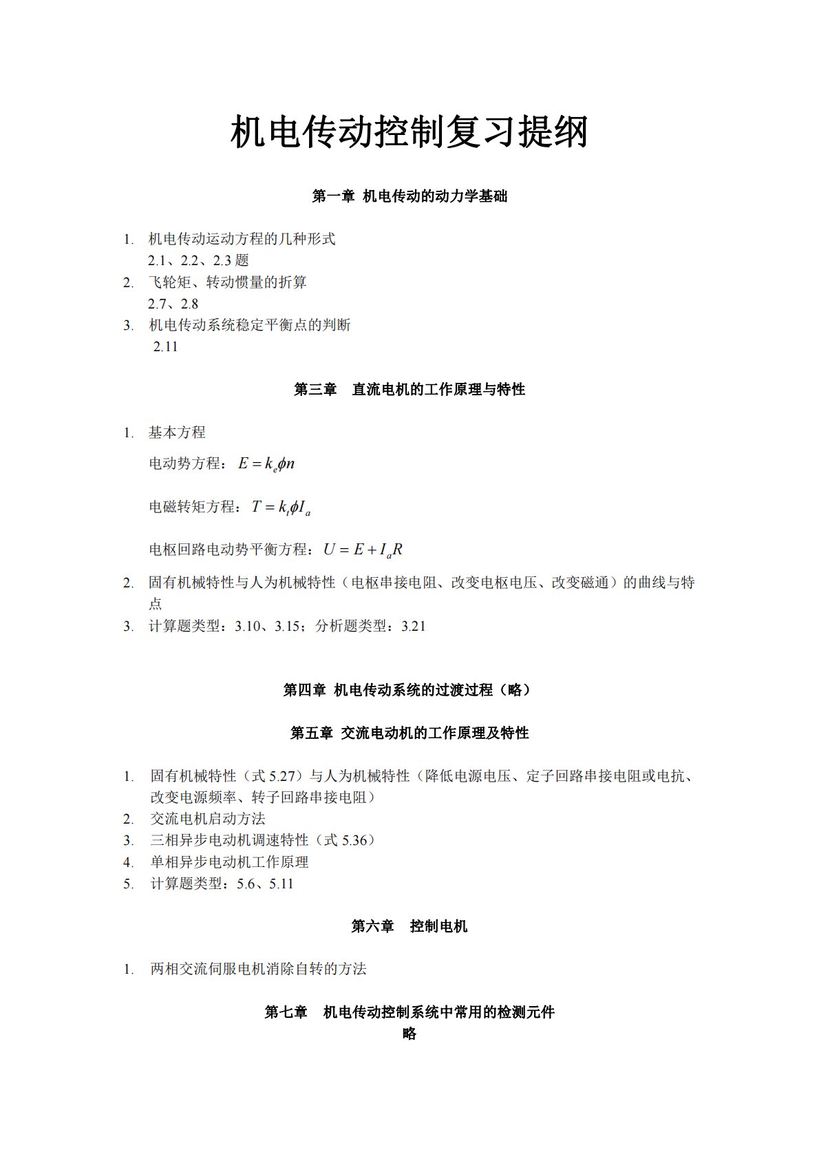 机电传动控制复习提纲第一章机电传动的动力学基础1.机电传动运动方程的几种形式2.1、2.2、2.3题2.飞轮矩、转动惯量的折算2.7、2.83.机电传动系统稳定平衡点的判断2.11第三章直流电机的工作原理与特性1.基本方程电动势方程:eEkn电磁转矩方程:taTkI电枢回路电动势平衡方程:aUEIR2.固有机械特性与人为机械特性(电枢串接电阻、改变电枢电压、改变磁通)的曲线与特点3.计算题类型:3.10、3.15;分析题类型:3.21第四章机电传动系统的过渡过程(略)第五章交流电动机的工作原理及特性1.固有机械特性(式5.27)与人为机械特性(降低电源电压、定子回路串接电阻或电抗、...