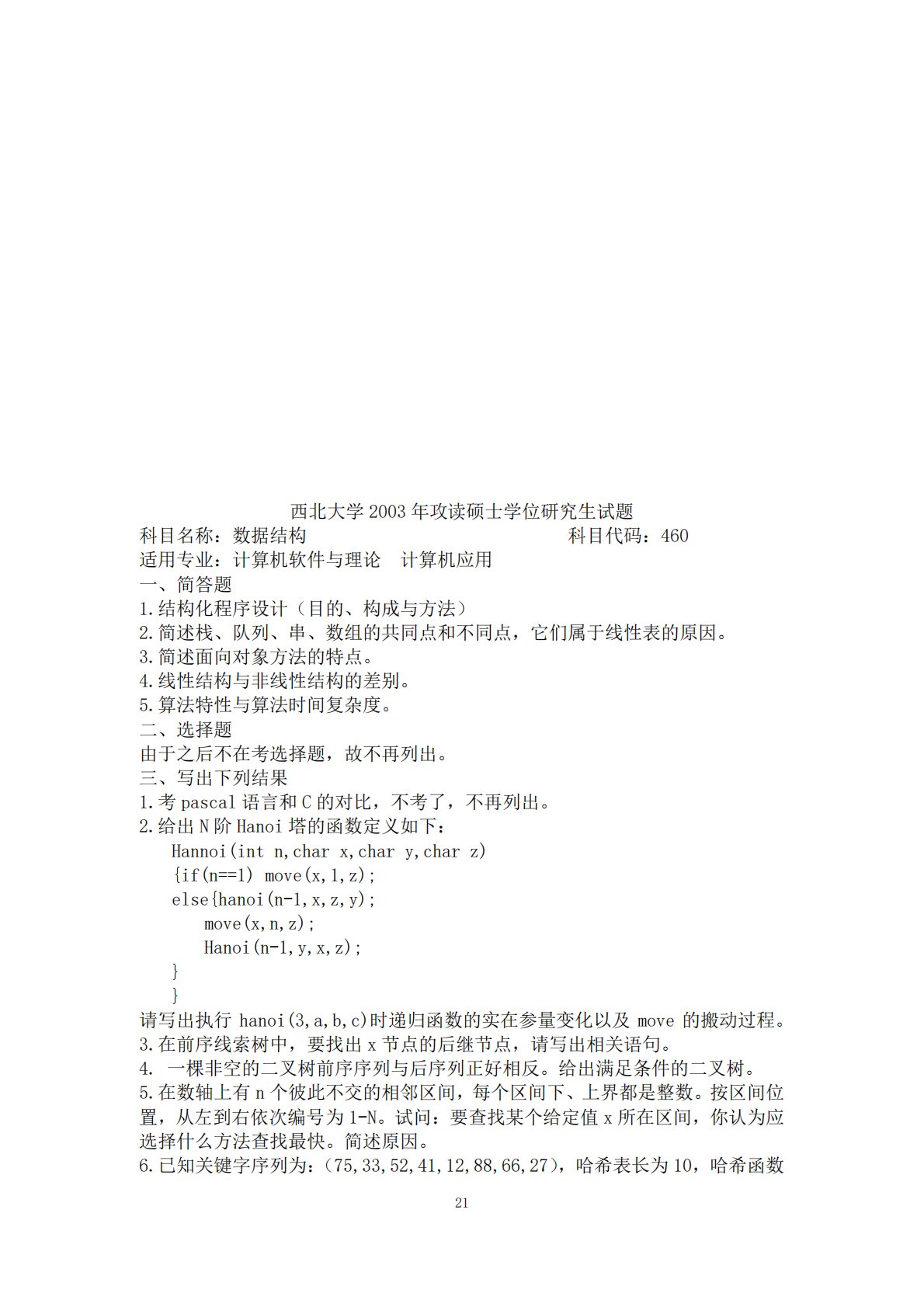 21西北大学2003年攻读硕士学位研究生试题科目名称:数据结构科目代码:460适用专业:计算机软件与理论计算机应用一、简答题1.结构化程序设计(目的、构成与方法)2.简述栈、队列、串、数组的共同点和不同点,它们属于线性表的原因。3.简述面向对象方法的特点。4.线性结构与非线性结构的差别。5.算法特性与算法时间复杂度。二、选择题由于之后不在考选择题,故不再列出。三、写出下列结果1.考pascal语言和C的对比,不考了,不再列出。2.给出N阶Hanoi塔的函数定义如下:Hannoi(intn,charx,chary,charz){if(n==1)move(x,1,z);else{hanoi(n-1...