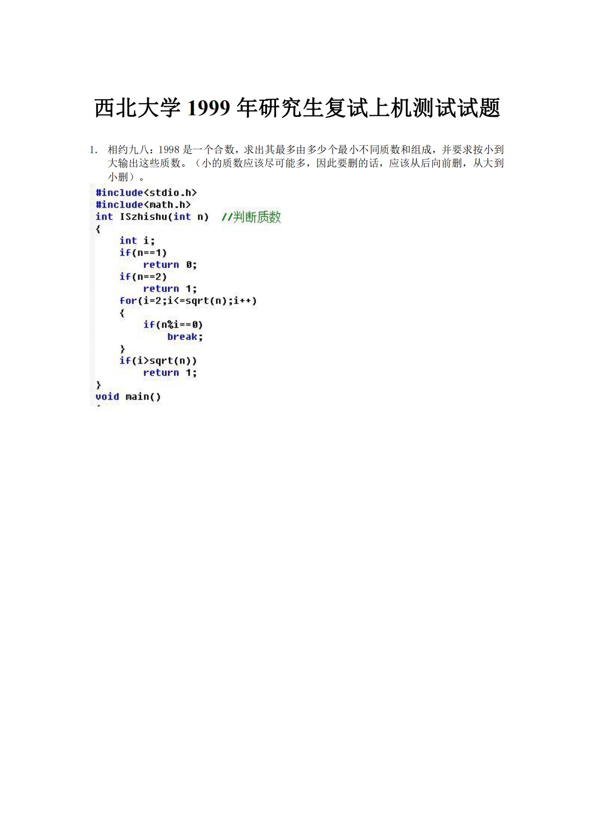 西北大学1999年研究生复试上机测试试题1.相约九八:1998是一个合数,求出其最多由多少个最小不同质数和组成,并要求按小到大输出这些质数。(小的质数应该尽可能多,因此要删的话,应该从后向前删,从大到小删)。西北大学1999年研究生复试上机测试试题1.相约九八:1998是一个合数,求出其最多由多少个最小不同质数和组成,并要求按小到大输出这些质数。(小的质数应该尽可能多,因此要删的话,应该从后向前删,从大到小删)。2.编程,按递增次序生成集合M的最小的100个数并输出之。M的定义为:①1∈M②X∈M,则2X+1∈M且3X+1∈M;显然M是一无限集合,M={1,3,4,7,9,…}3.输入一批数据...