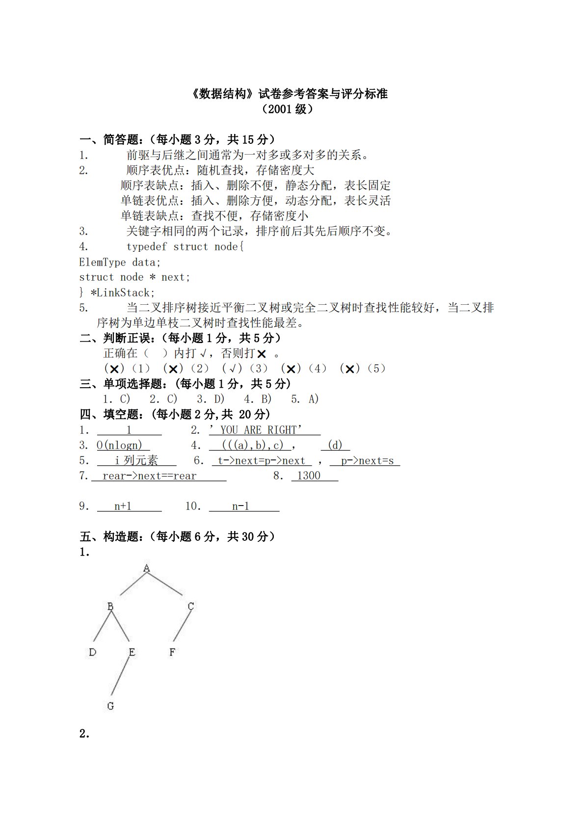 《数据结构》试卷参考答案与评分标准(2001级)一、简答题:(每小题3分,共15分)1.前驱与后继之间通常为一对多或多对多的关系。2.顺序表优点:随机查找,存储密度大顺序表缺点:插入、删除不便,静态分配,表长固定单链表优点:插入、删除方便,动态分配,表长灵活单链表缺点:查找不便,存储密度小3.关键字相同的两个记录,排序前后其先后顺序不变。4.typedefstructnode{ElemTypedata;structnode*next;}*LinkStack;5.当二叉排序树接近平衡二叉树或完全二叉树时查找性能较好,当二叉排序树为单边单枝二叉树时查找性能最差。二、判断正误:(每小题1分,共5分)...