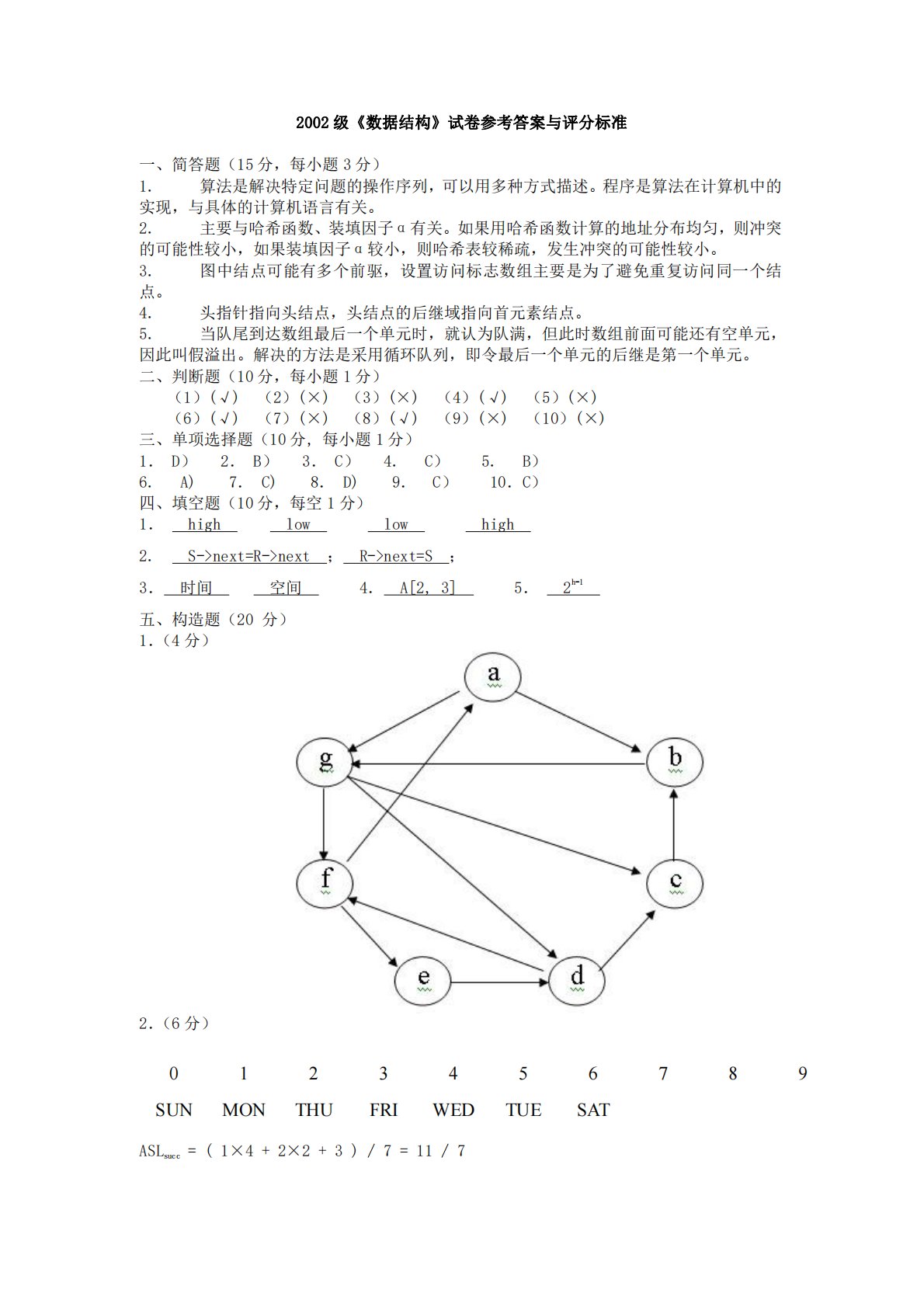 2002级《数据结构》试卷参考答案与评分标准一、简答题(15分,每小题3分)1.算法是解决特定问题的操作序列,可以用多种方式描述。程序是算法在计算机中的实现,与具体的计算机语言有关。2.主要与哈希函数、装填因子α有关。如果用哈希函数计算的地址分布均匀,则冲突的可能性较小,如果装填因子α较小,则哈希表较稀疏,发生冲突的可能性较小。3.图中结点可能有多个前驱,设置访问标志数组主要是为了避免重复访问同一个结点。4.头指针指向头结点,头结点的后继域指向首元素结点。5.当队尾到达数组最后一个单元时,就认为队满,但此时数组前面可能还有空单元,因此叫假溢出。解决的方法是采用循环队列,即令最后一个单元的后继是...