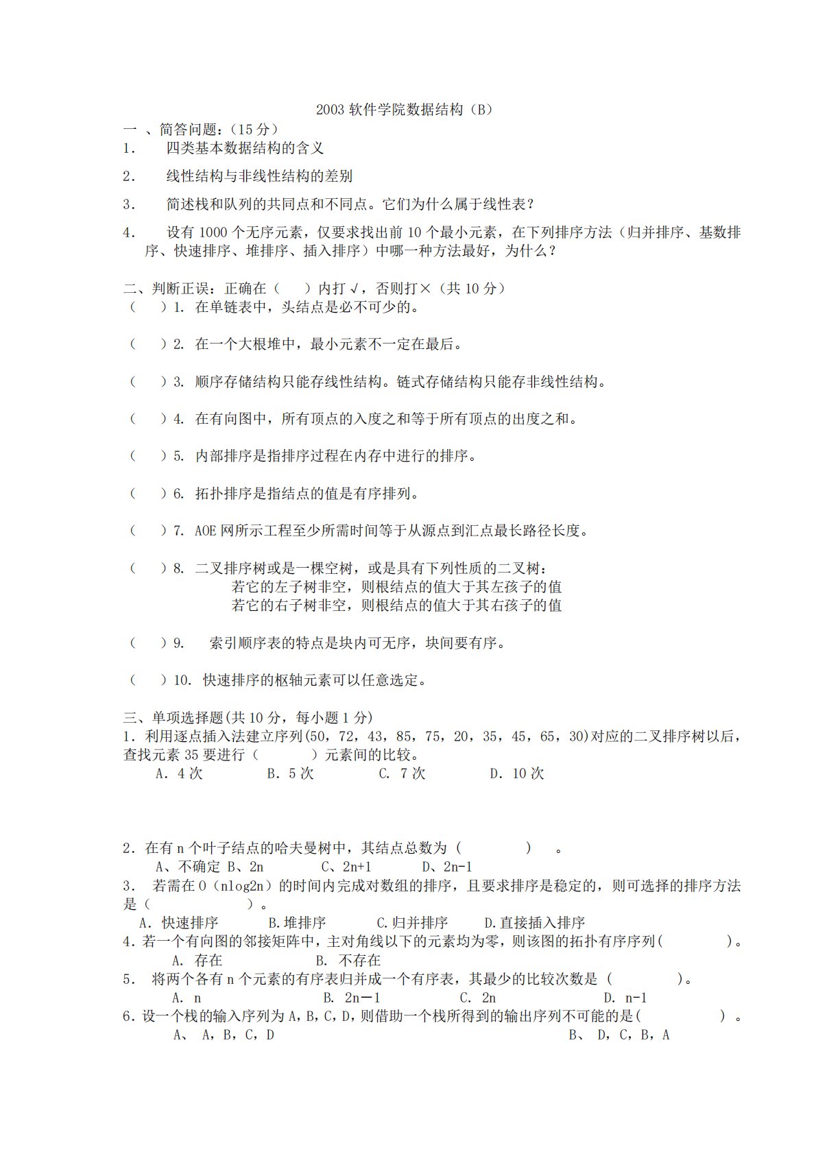 2003软件学院数据结构(B)一、简答问题:(15分)1.四类基本数据结构的含义2.线性结构与非线性结构的差别3.简述栈和队列的共同点和不同点。它们为什么属于线性表?4.设有1000个无序元素,仅要求找出前10个最小元素,在下列排序方法(归并排序、基数排序、快速排序、堆排序、插入排序)中哪一种方法最好,为什么?二、判断正误:正确在()内打√,否则打×(共10分)()1.在单链表中,头结点是必不可少的。()2.在一个大根堆中,最小元素不一定在最后。()3.顺序存储结构只能存线性结构。链式存储结构只能存非线性结构。()4.在有向图中,所有顶点的入度之和等于所有顶点的出度之和。()5.内部排序是指排...