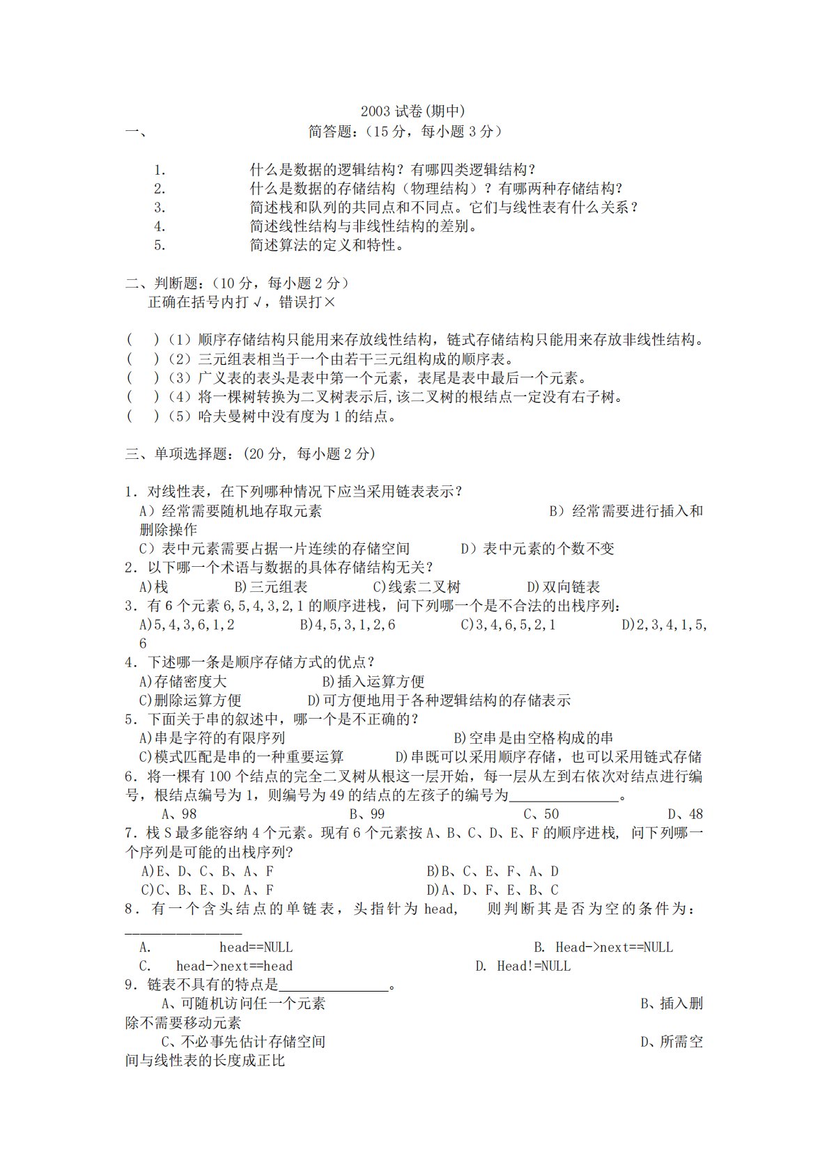 2003试卷(期中)一、简答题:(15分,每小题3分)1.什么是数据的逻辑结构?有哪四类逻辑结构?2.什么是数据的存储结构(物理结构)?有哪两种存储结构?3.简述栈和队列的共同点和不同点。它们与线性表有什么关系?4.简述线性结构与非线性结构的差别。5.简述算法的定义和特性。二、判断题:(10分,每小题2分)正确在括号内打√,错误打×()(1)顺序存储结构只能用来存放线性结构,链式存储结构只能用来存放非线性结构。()(2)三元组表相当于一个由若干三元组构成的顺序表。()(3)广义表的表头是表中第一个元素,表尾是表中最后一个元素。()(4)将一棵树转换为二叉树表示后,该二叉树的根结点一定没有右子树...