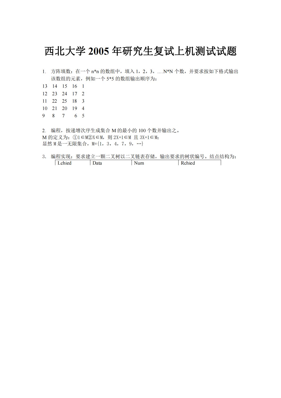 西北大学2005年研究生复试上机测试试题1.方阵填数:在一个n*n的数组中,填入1,2,3,….N*N个数,并要求按如下格式输出该数组的元素,例如一个5*5的数组输出顺序为:131415161122324172112225183102120194987652.编程,按递增次序生成集合M的最小的100个数并输出之。M的定义为:①1∈M②X∈M,则2X+1∈M且3X+1∈M;显然M是一无限集合,M={1,3,4,7,9,…}3.编程实现:要求建立一颗二叉树以二叉链表存储,输出要求的树状编号。结点结构为:LchiedDataNumRchied西北大学2005年研究生复试上机测试试题1.方阵填数:在一...