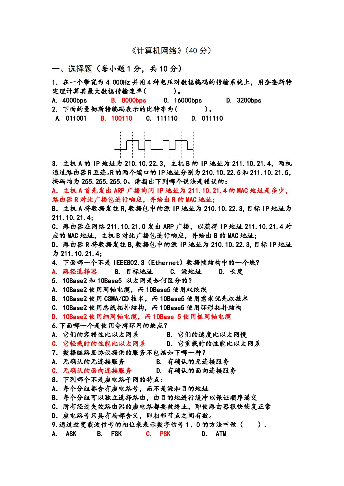 《计算机网络》(40分)一、选择题(每小题1分,共10分)1.在一个带宽为4000Hz并用4种电压对数据编码的传输系统上,用奈奎斯特定理计算其最大数据传输速率()。A.4000bpsB.8000bpsC.16000bpsD.3200bps2.下面的曼彻斯特编码表示的比特串为()。A.011001B.100110C.111110D.0111103.主机A的IP地址为210.10.22.3,主机B的IP地址为211.10.21.4,两机通过路由器R互连。R的两个端口的IP地址分别为210.10.22.5和211.10.21.5,掩码均为255.255.255.0。请指出下列哪个说法是错误的:A.主...
