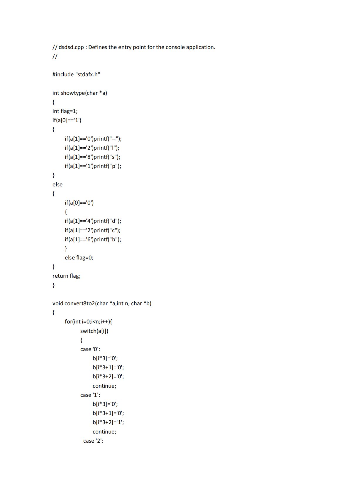 //dsdsd.cpp:Definestheentrypointfortheconsoleapplication.//#include"stdafx.h"intshowtype(char*a){intflag=1;if(a[0]=='1'){if(a[1]=='0')printf("--");if(a[1]=='2')printf("l");if(a[1]=='8')printf("s");if(a[1]=='1')printf("p");}else{if(a[0]=='0'){if(a[1]=='4')printf("d");if(a[1]=='2')printf("c");if(a[1]=...