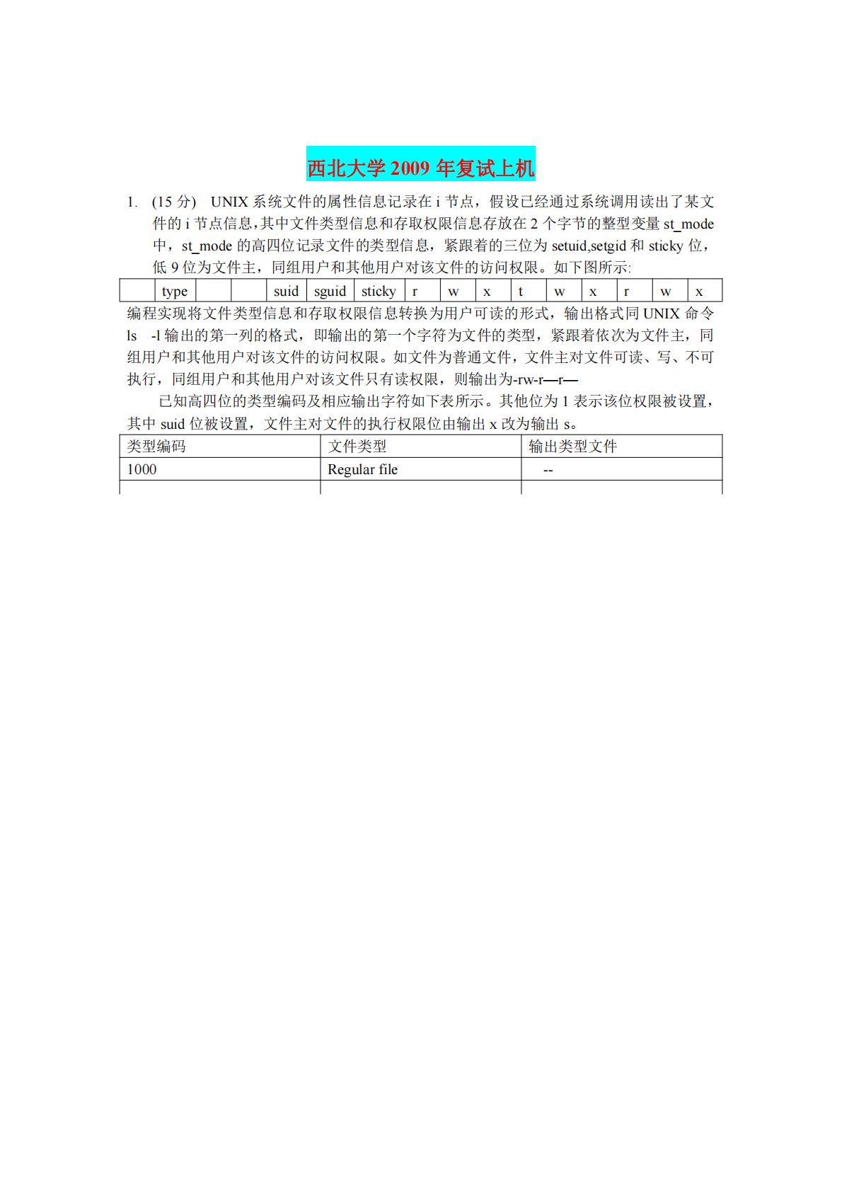 西北大学2009年复试上机1.(15分)UNIX系统文件的属性信息记录在i节点,假设已经通过系统调用读出了某文件的i节点信息,其中文件类型信息和存取权限信息存放在2个字节的整型变量st_mode中,st_mode的高四位记录文件的类型信息,紧跟着的三位为setuid,setgid和sticky位,低9位为文件主,同组用户和其他用户对该文件的访问权限。如下图所示:typesuidsguidstickyrwxtwxrwx编程实现将文件类型信息和存取权限信息转换为用户可读的形式,输出格式同UNIX命令ls-l输出的第一列的格式,即输出的第一个字符为文件的类型,紧跟着依次为文件主,同组用户和其他用户对...