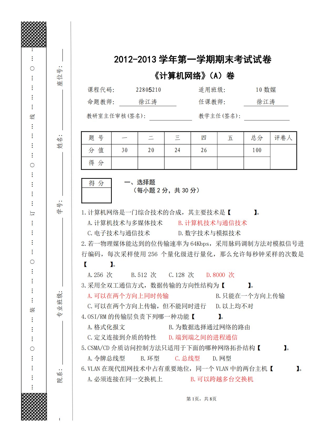 第1页,共8页………○…………○………装…………○…………订…………○…………线…………○…………-院系:专业班级:学号:姓名:座位号:-2012-2013学年第一学期期末考试试卷《计算机网络》(A)卷题号一二三四五总分评卷人分值30202426100得分得分一、选择题(每小题2分,共30分)1.计算机网络是一门综合技术的合成,其主要技术是【】。A.计算机技术与多媒体技术B.计算机技术与通信技术C.电子技术与通信技术D.数字技术与模拟技术2.若一物理媒体能达到的位传输速率为64Kbps,采用脉码调制方法对模拟信号进行编码,每次采样使用256个量化级进行量化,那么允许每秒钟采样的次数是【】。A....