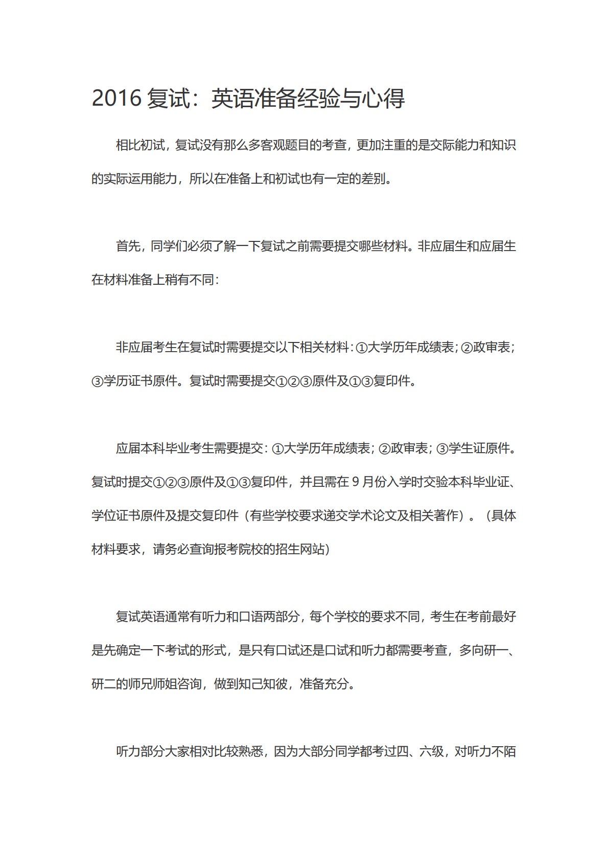 2016复试:英语准备经验与心得相比初试,复试没有那么多客观题目的考查,更加注重的是交际能力和知识的实际运用能力,所以在准备上和初试也有一定的差别。首先,同学们必须了解一下复试之前需要提交哪些材料。非应届生和应届生在材料准备上稍有不同:非应届考生在复试时需要提交以下相关材料:①大学历年成绩表;②政审表;③学历证书原件。复试时需要提交①②③原件及①③复印件。应届本科毕业考生需要提交:①大学历年成绩表;②政审表;③学生证原件。复试时提交①②③原件及①③复印件,并且需在9月份入学时交验本科毕业证、学位证书原件及提交复印件(有些学校要求递交学术论文及相关著作)。(具体材料要求,请务必查询报考院校的招生...